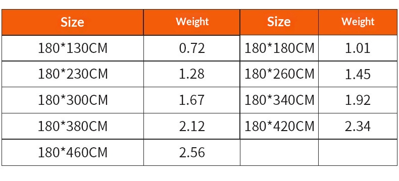 Dimensions: 180 x 130 cm, 180 x 180 cm, 180 x 230 cm, 180 x 260 cm, 180 x 300 cm