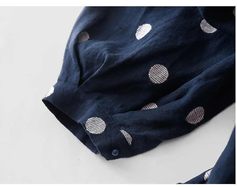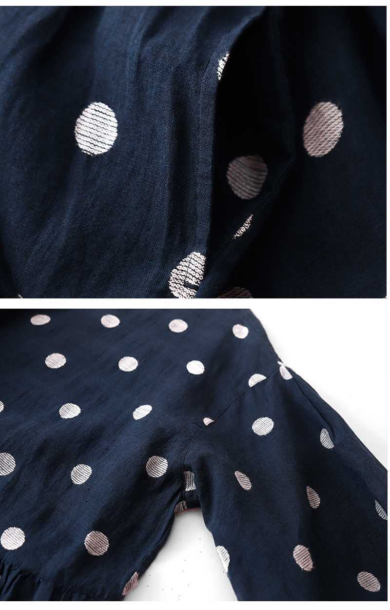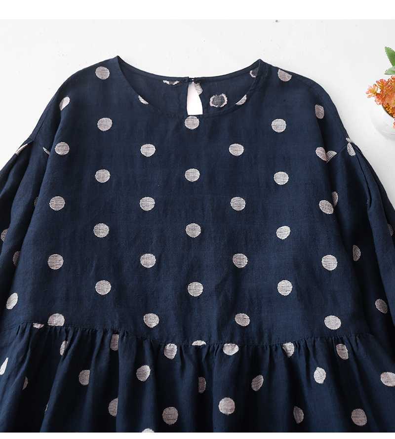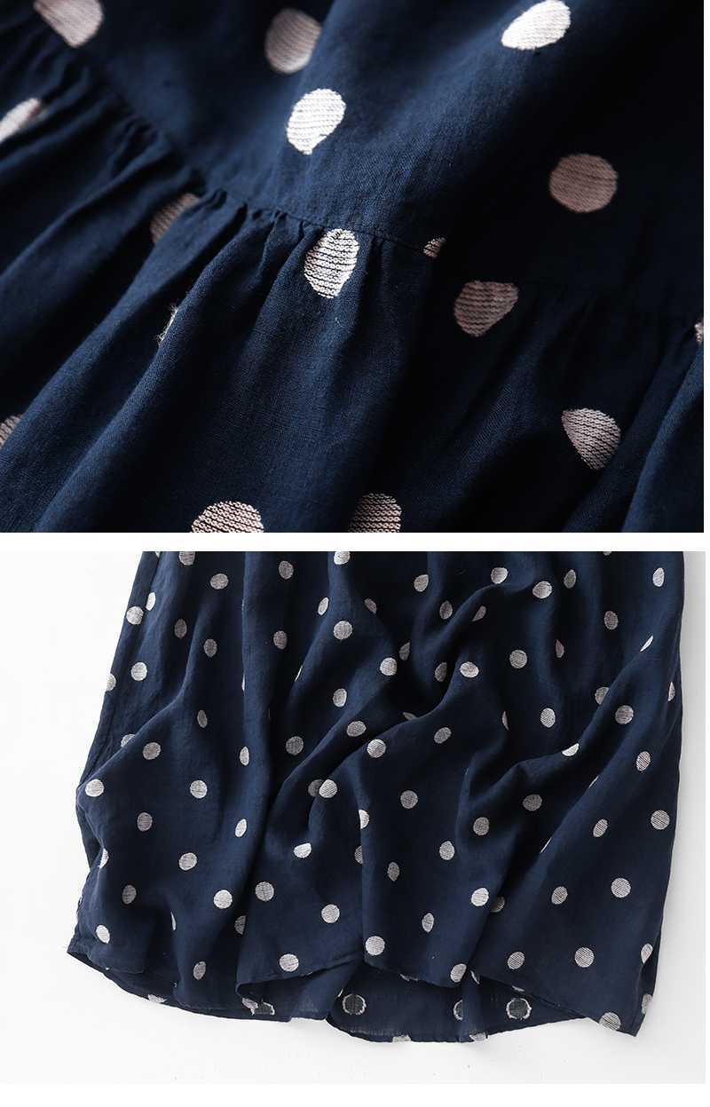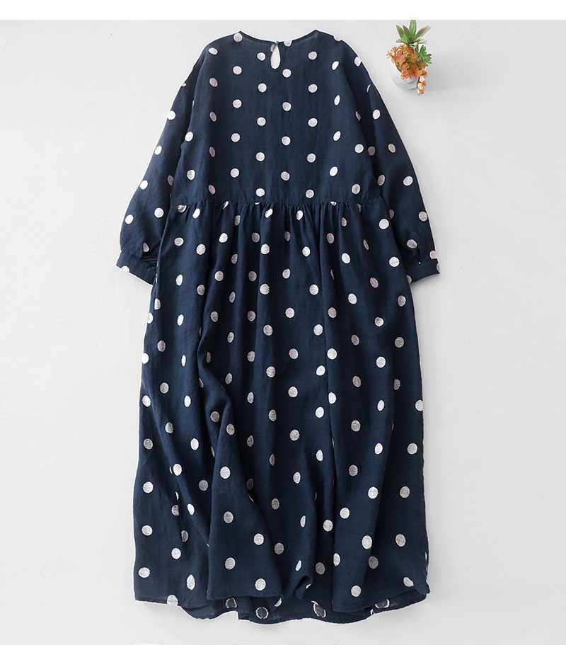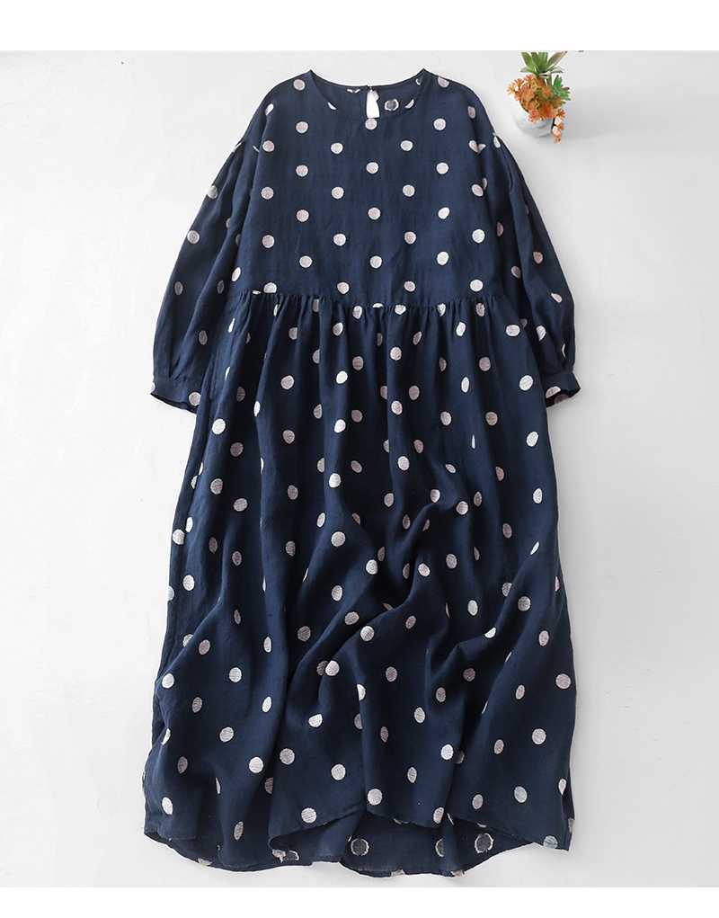 Artistic Retro Blue Polka-Dot Dress Crew-Neck Long-Sleeve French-Elegance Cotton-Linen Jumper Dress