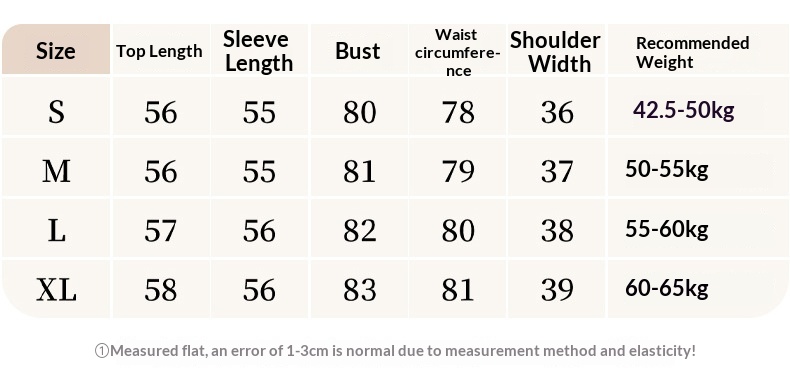 Sizes: S recommended for 42.5–50 kg, M recommended for 50–55 kg, L recommended for 55–60 kg, XL recommended for 60–65 kg
