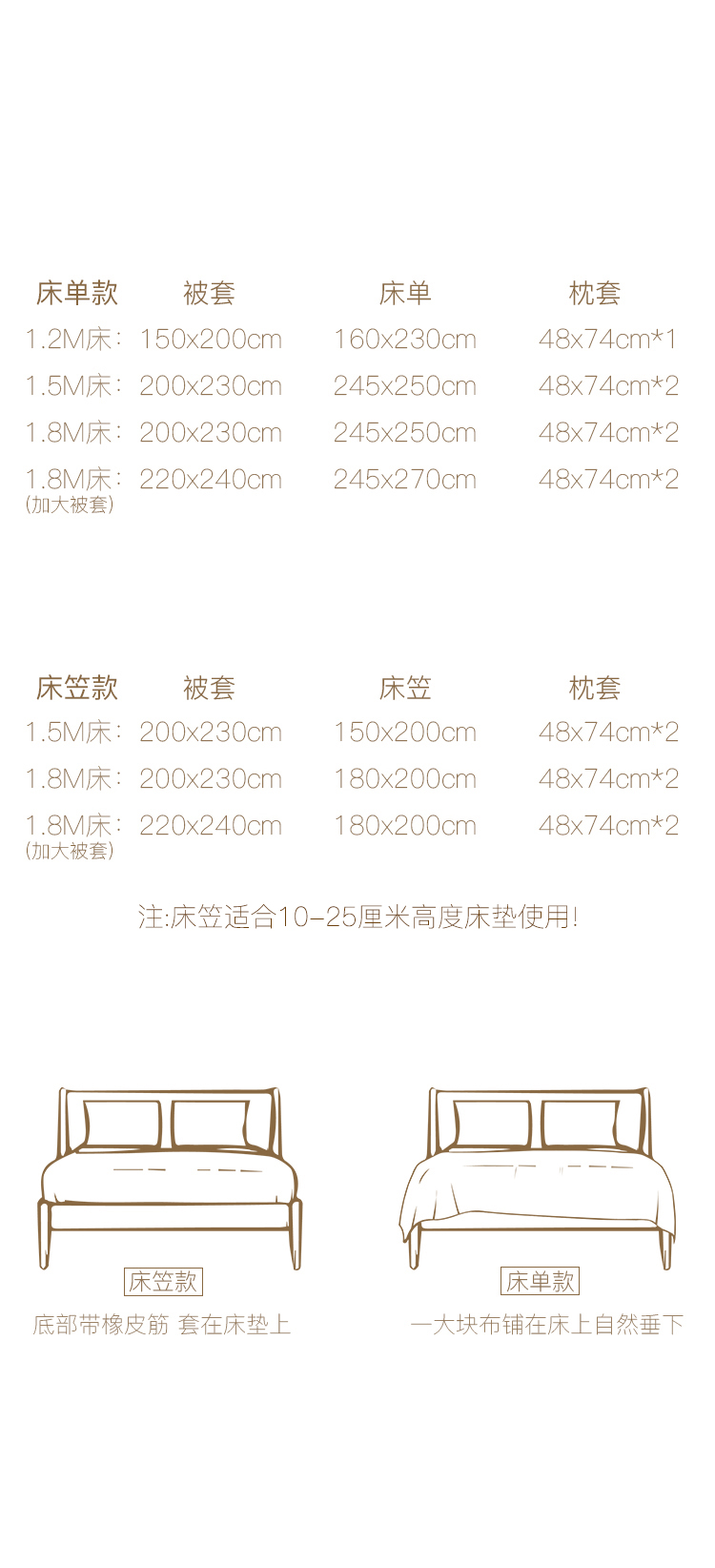 Applicable bed sizes: 1.5m bed four piece set/suitable for 200 * 230cm core, 1.8m bed four piece set/suitable for 200 * 230cm core, 1.8m bed four piece set/suitable for 220x240cm core