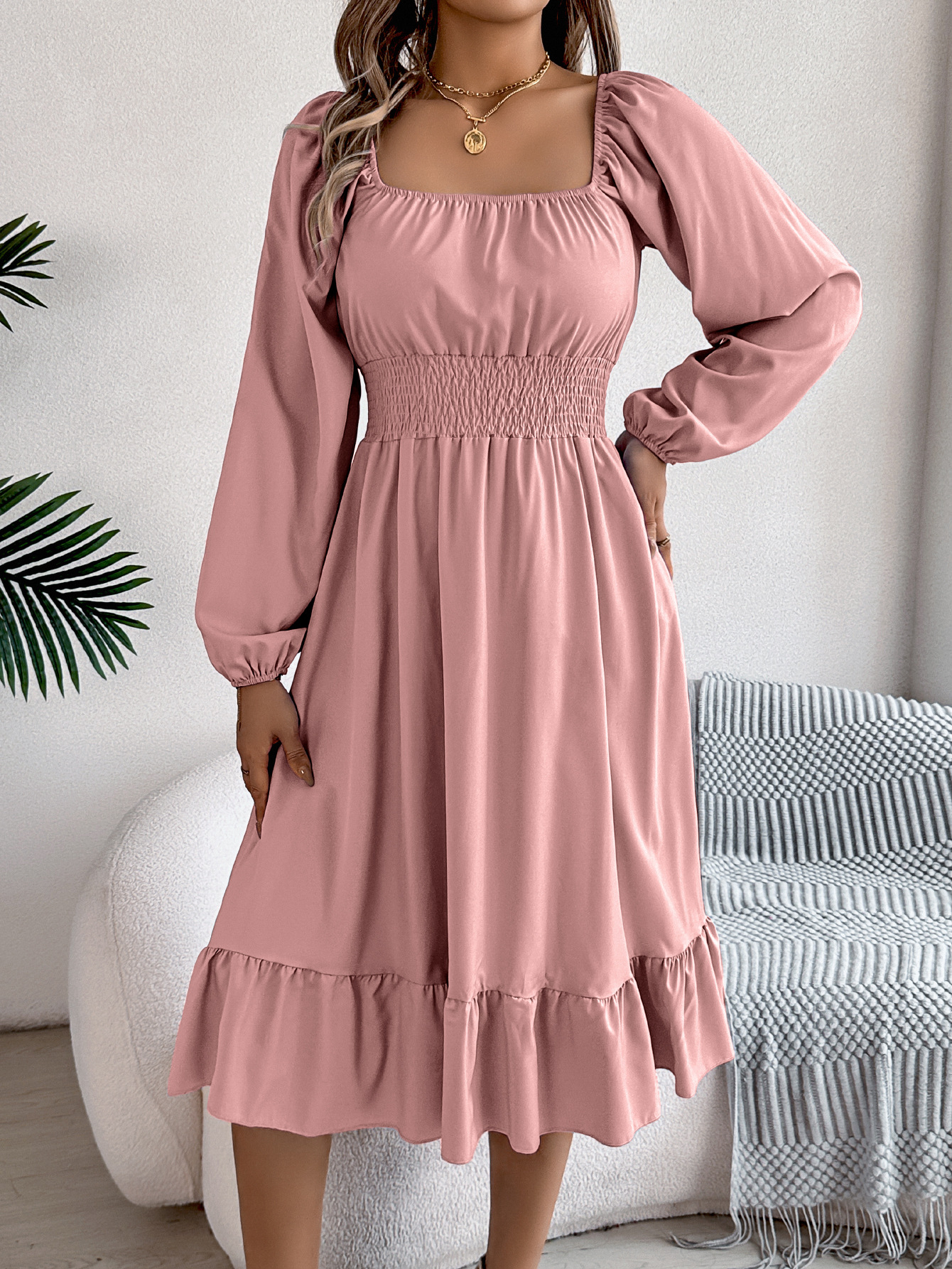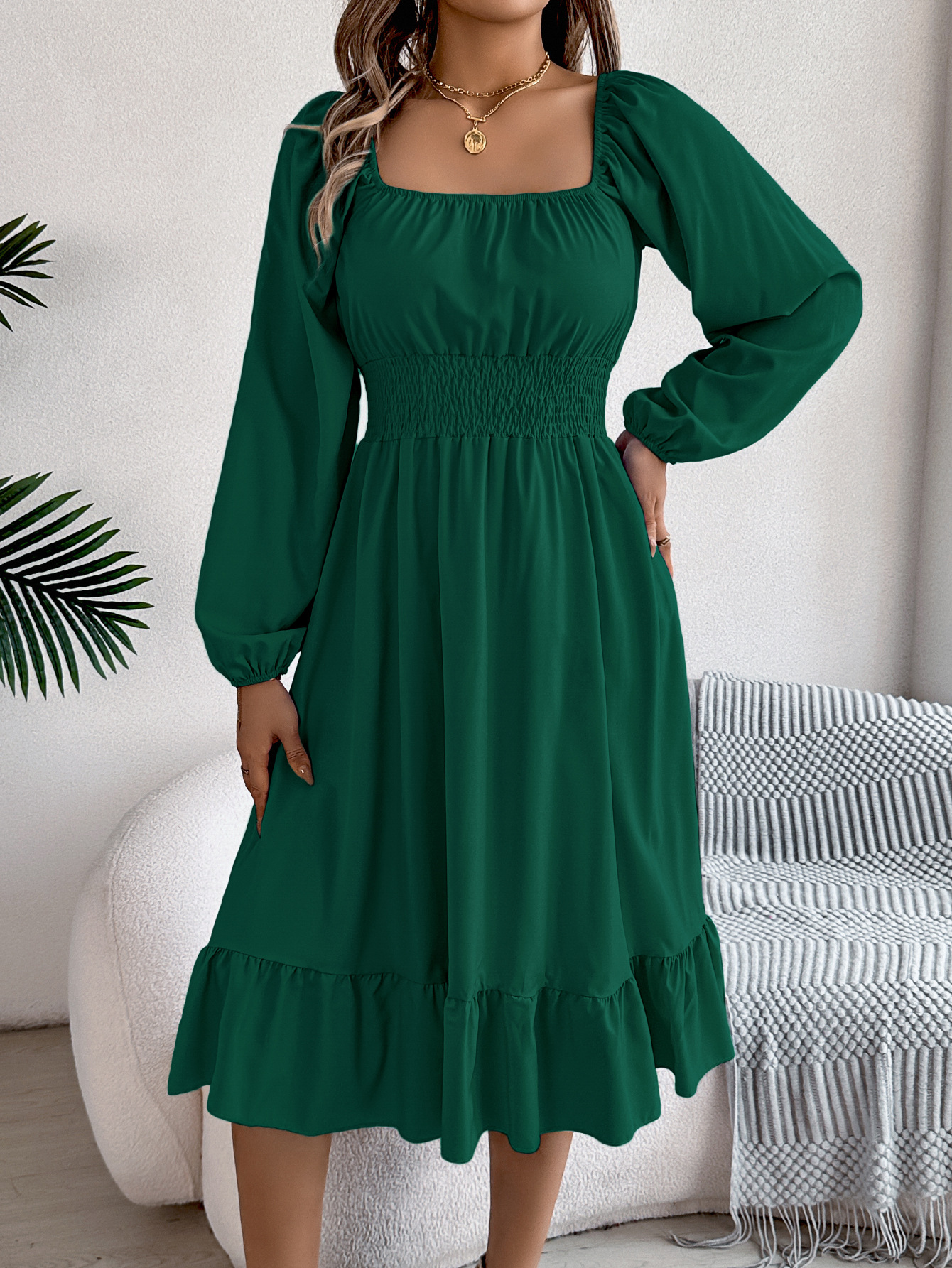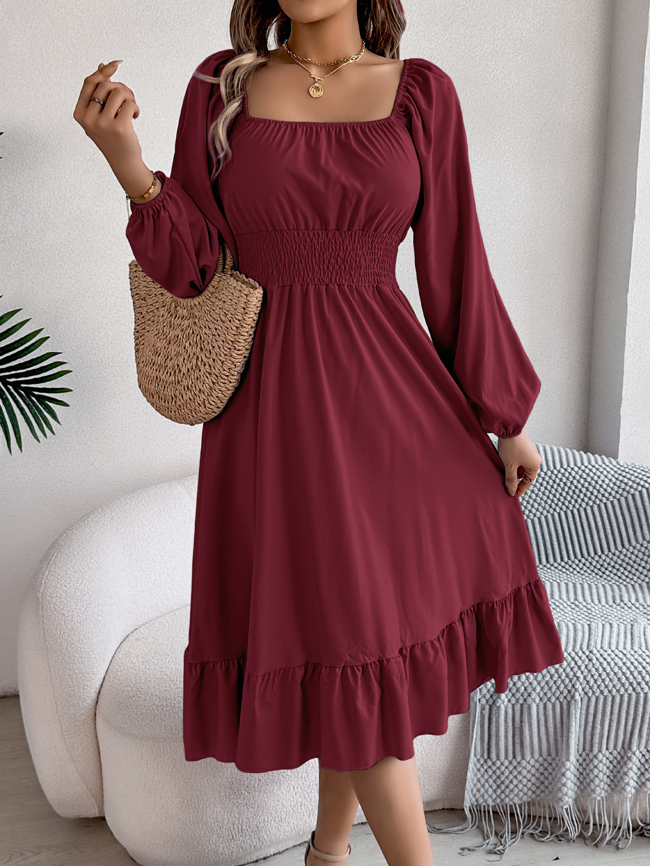 Casual Solid Color Square Collar Long Sleeve Waist Trimming Ruffles A- Line Skirt