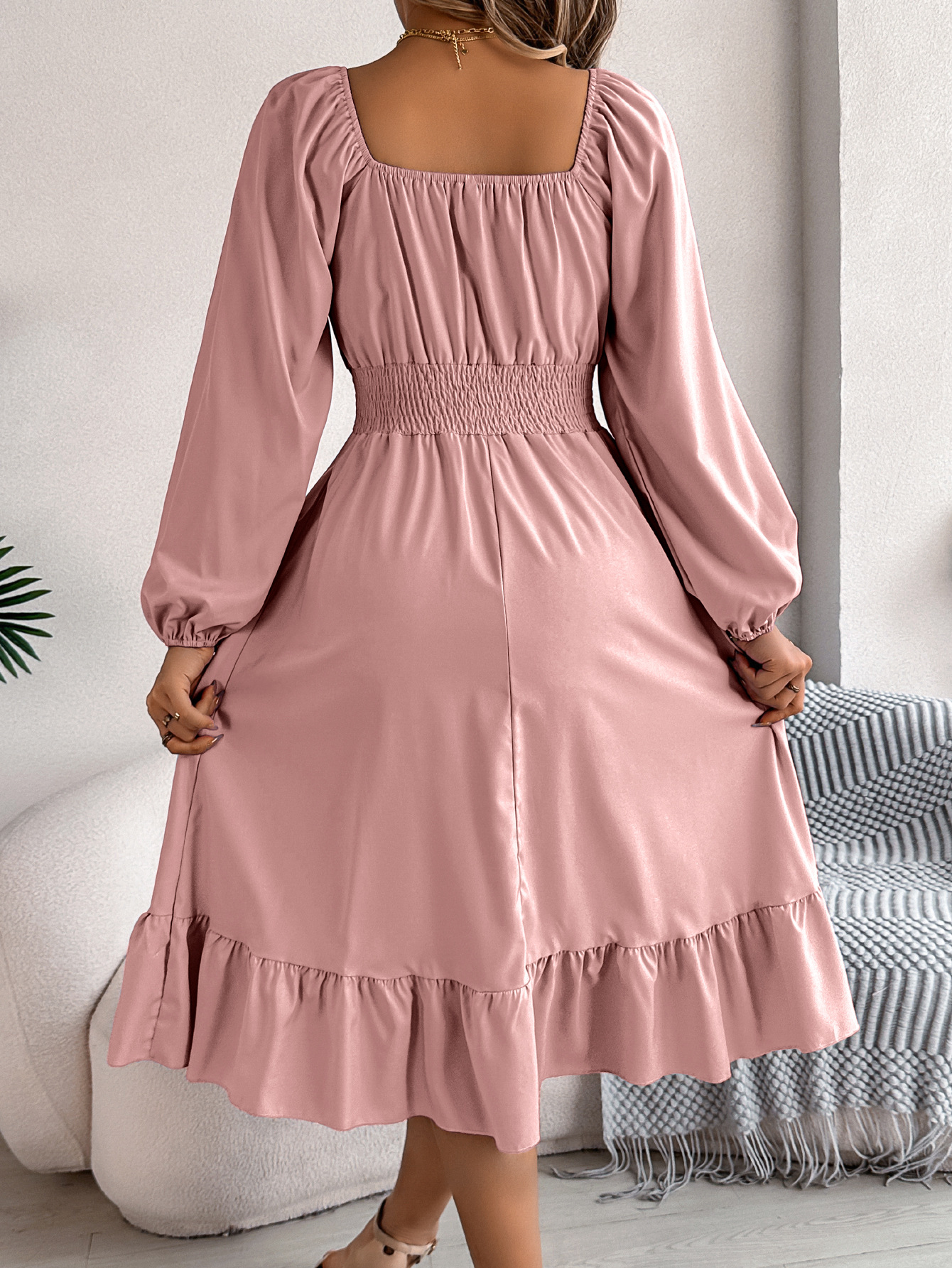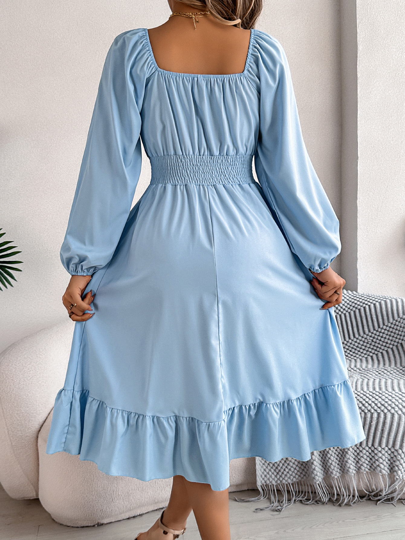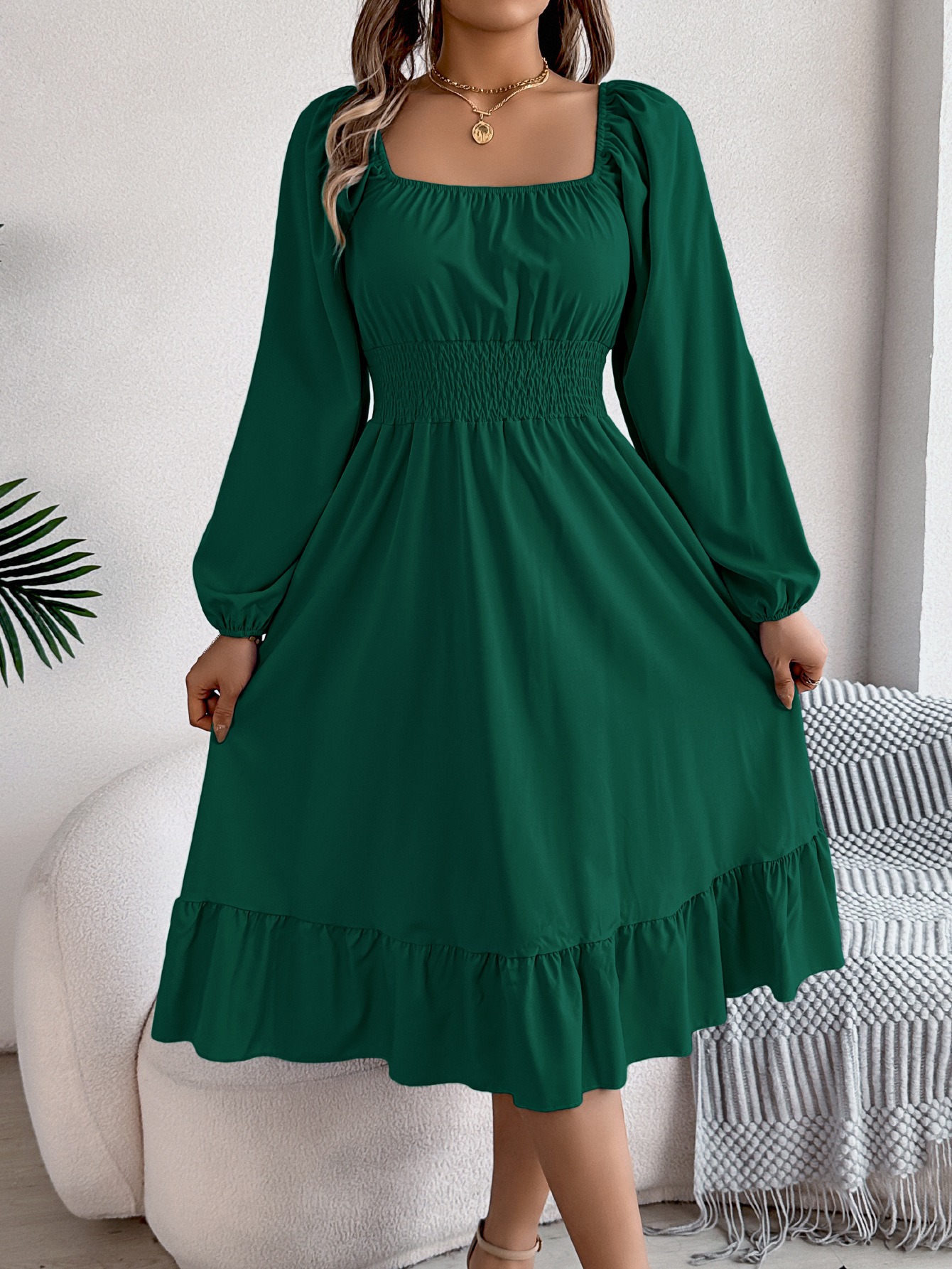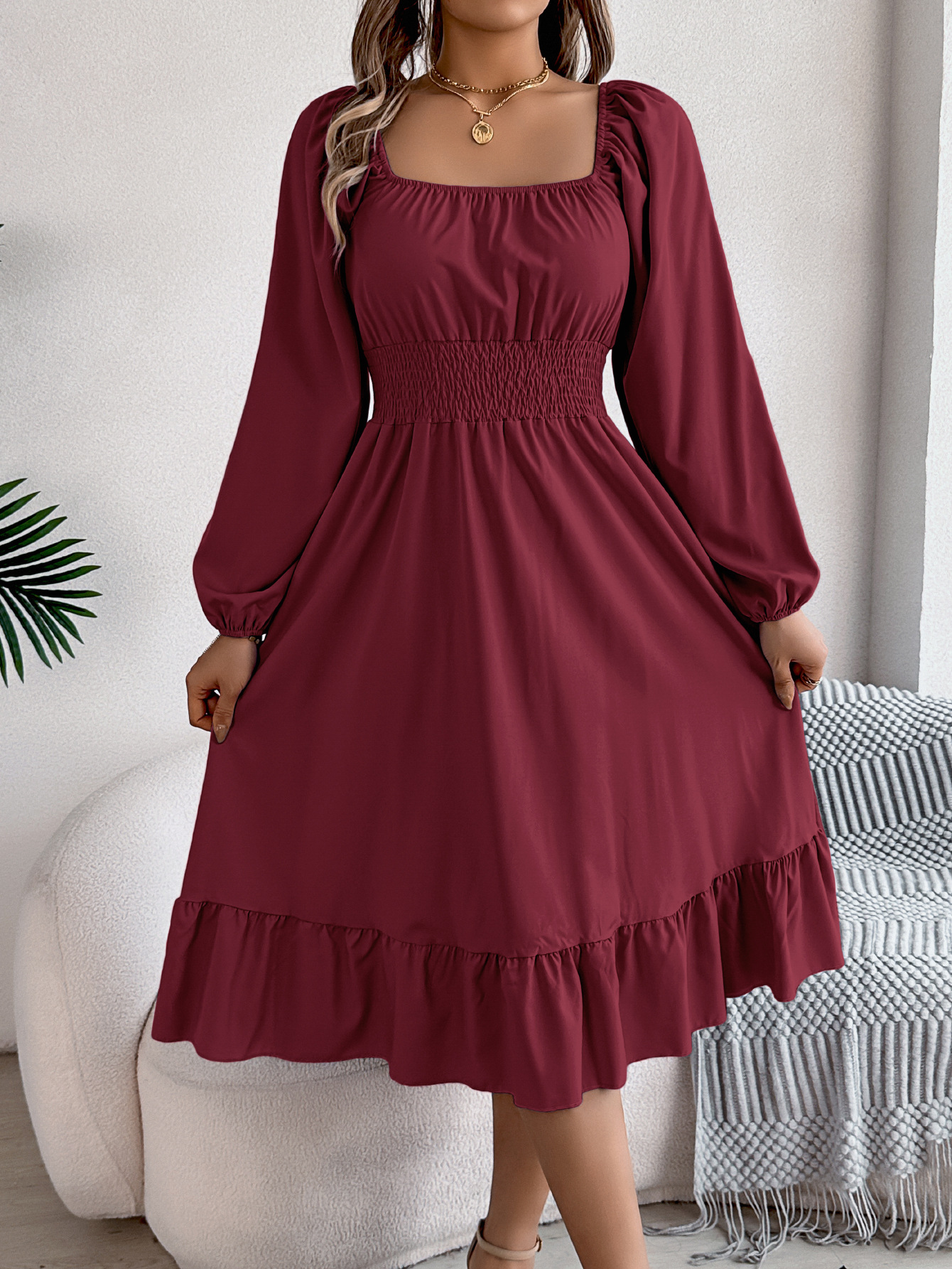 Casual Solid Color Square Collar Long Sleeve Waist Trimming Ruffles A- Line Skirt