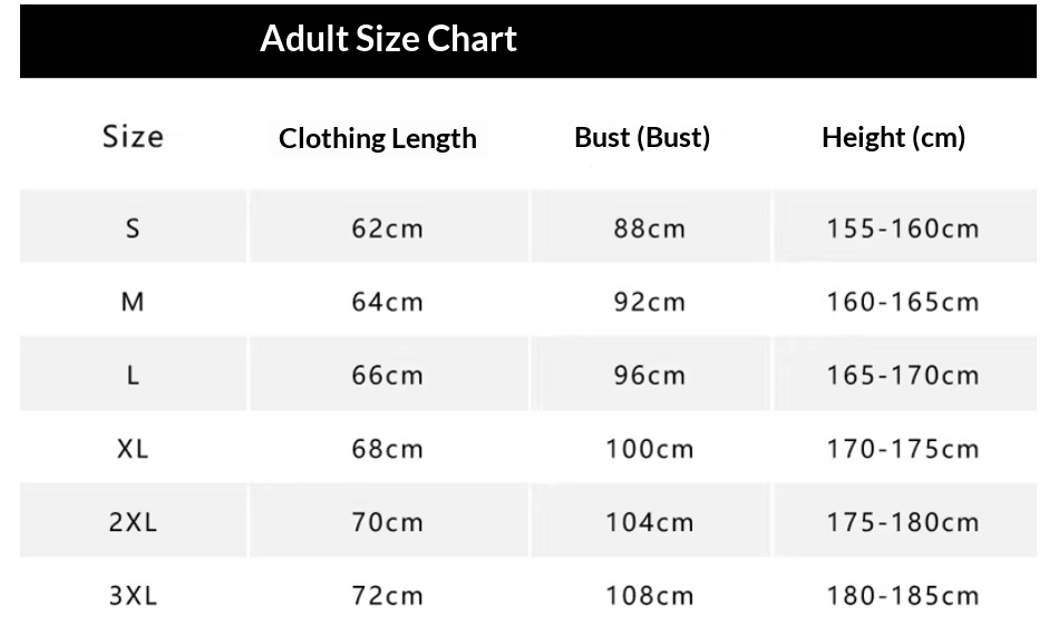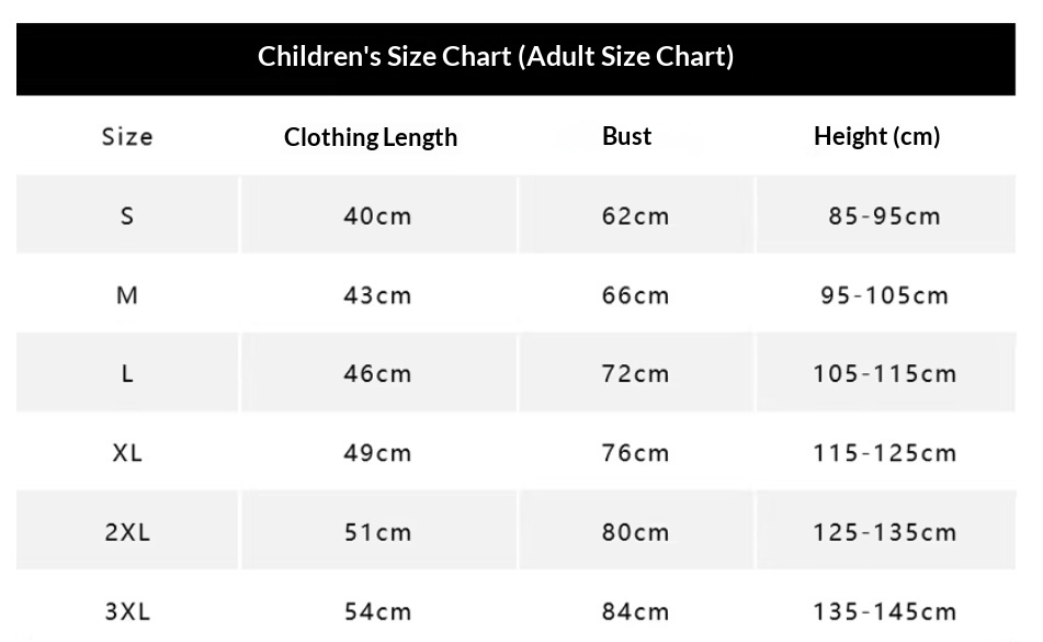 Size XS,S,M,L,XL,2XL,3XL,4XL, children s, children m, children l, children 2XL, children 3XL.