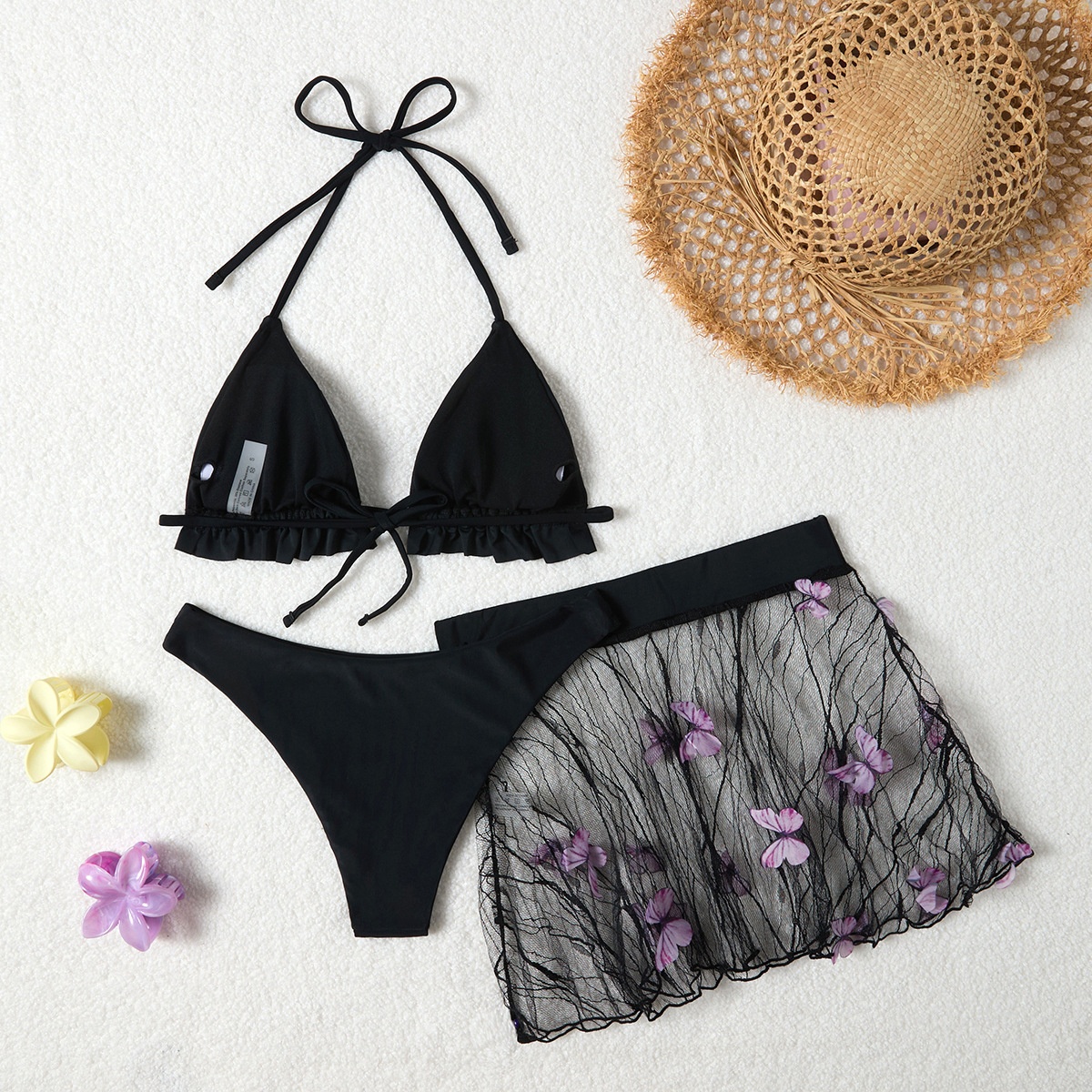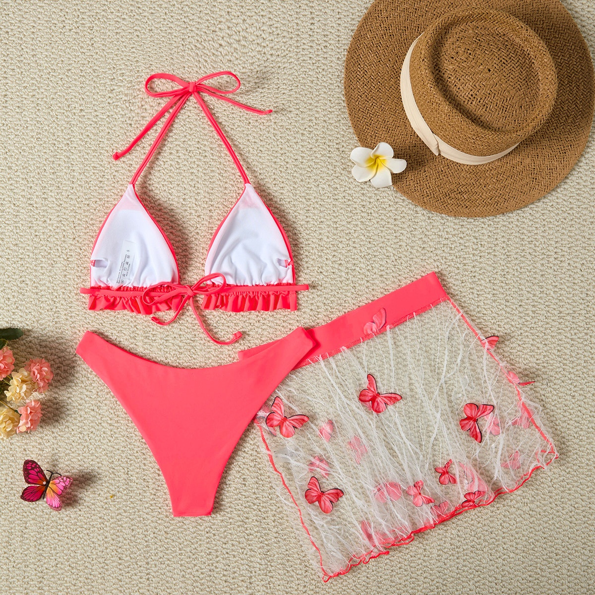 Color: Cross-border solid-color bikini three-piece set, cross-border rose-red bikini three-piece set
