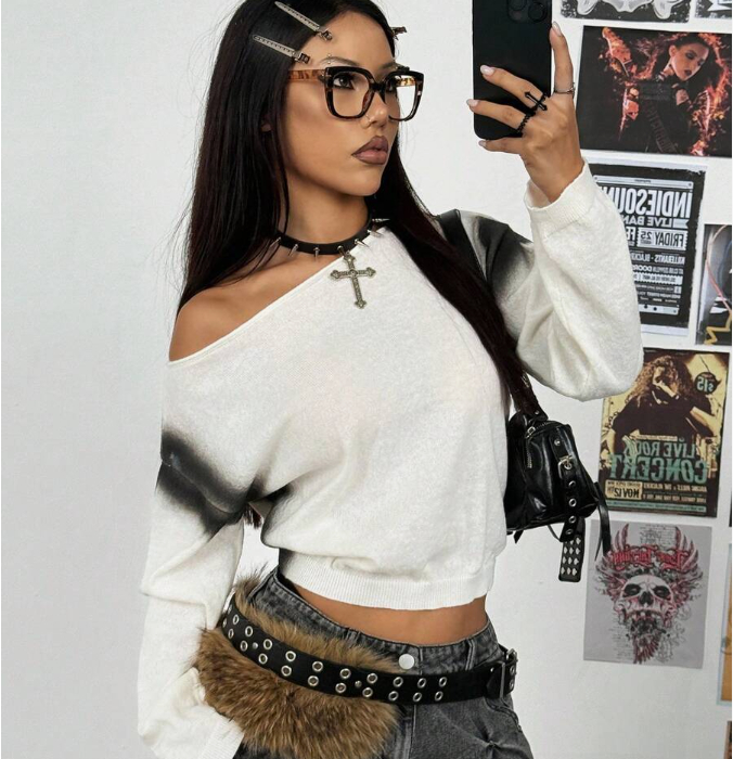 0 Review for Contrast Color Graffiti Slant Shoulder Casual Loose Sweater