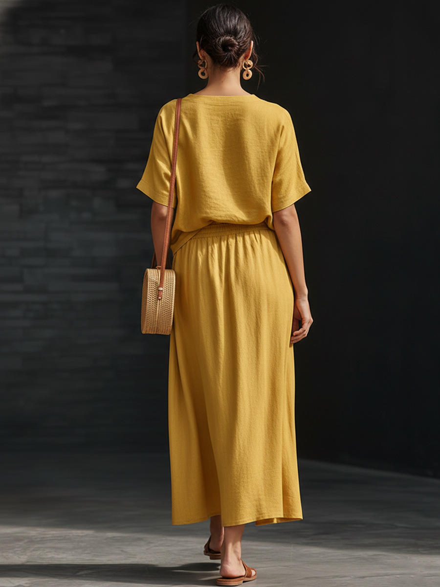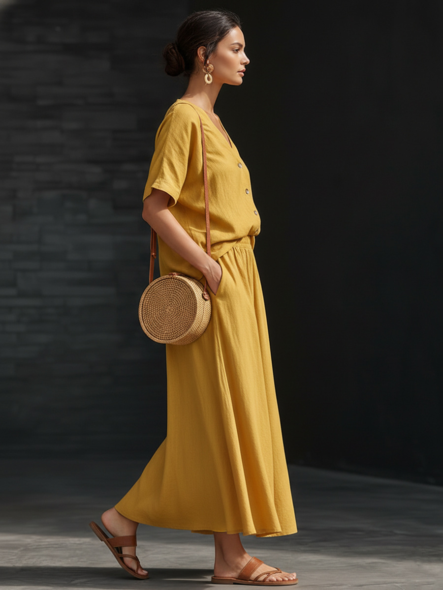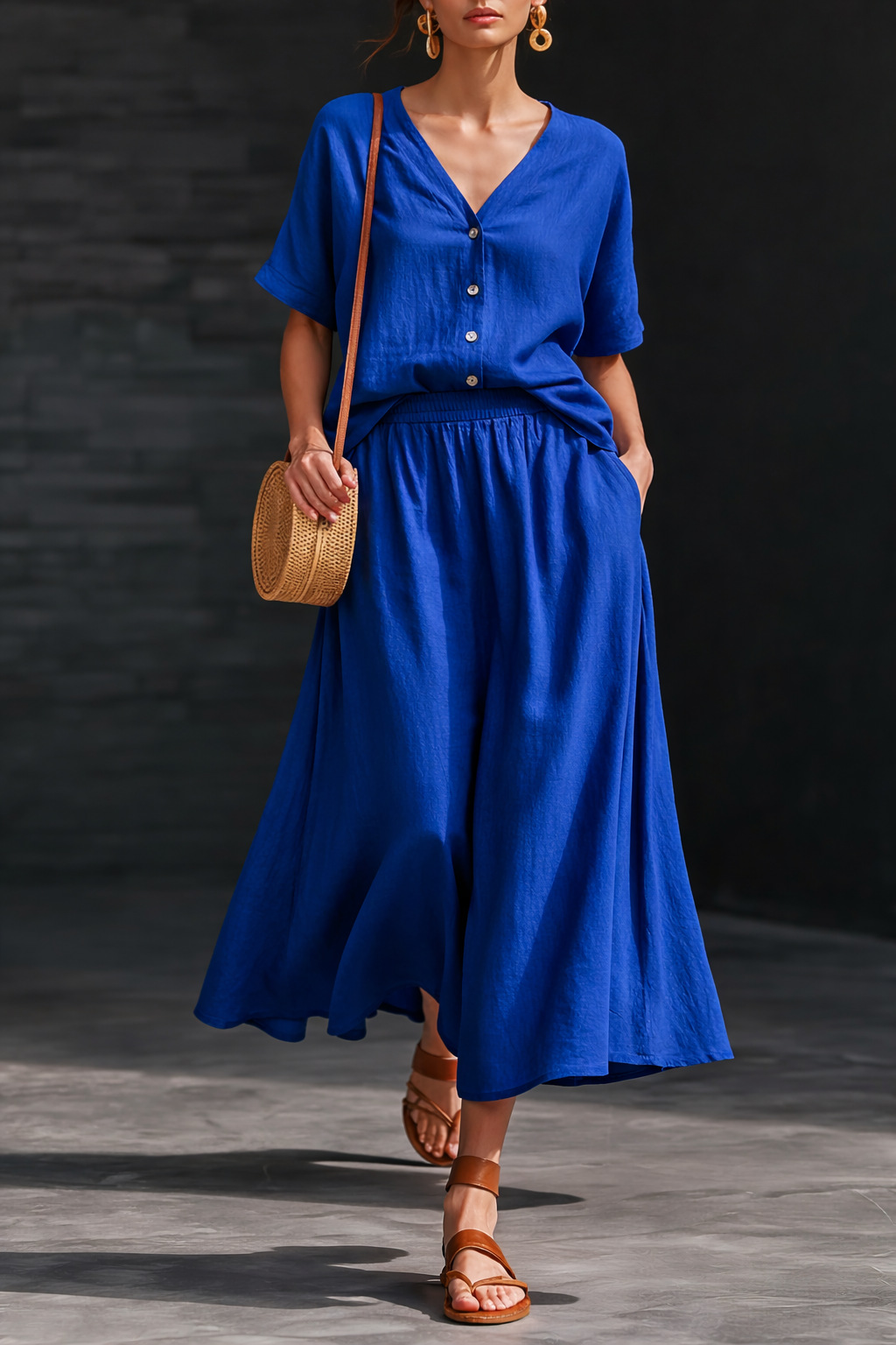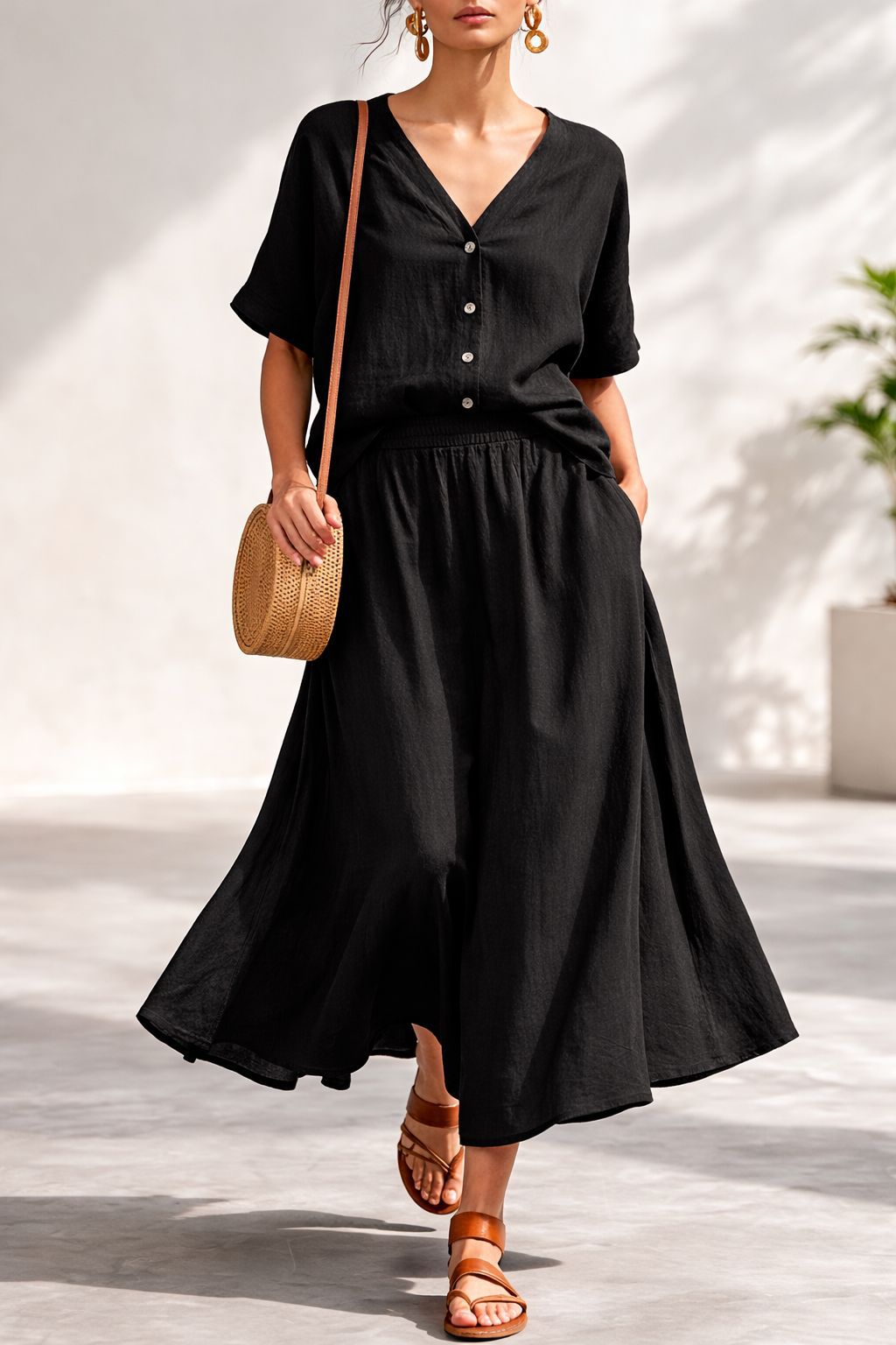 0 Review for Cotton-linen V-neck Button-up Short-sleeve Top And Skirt Set