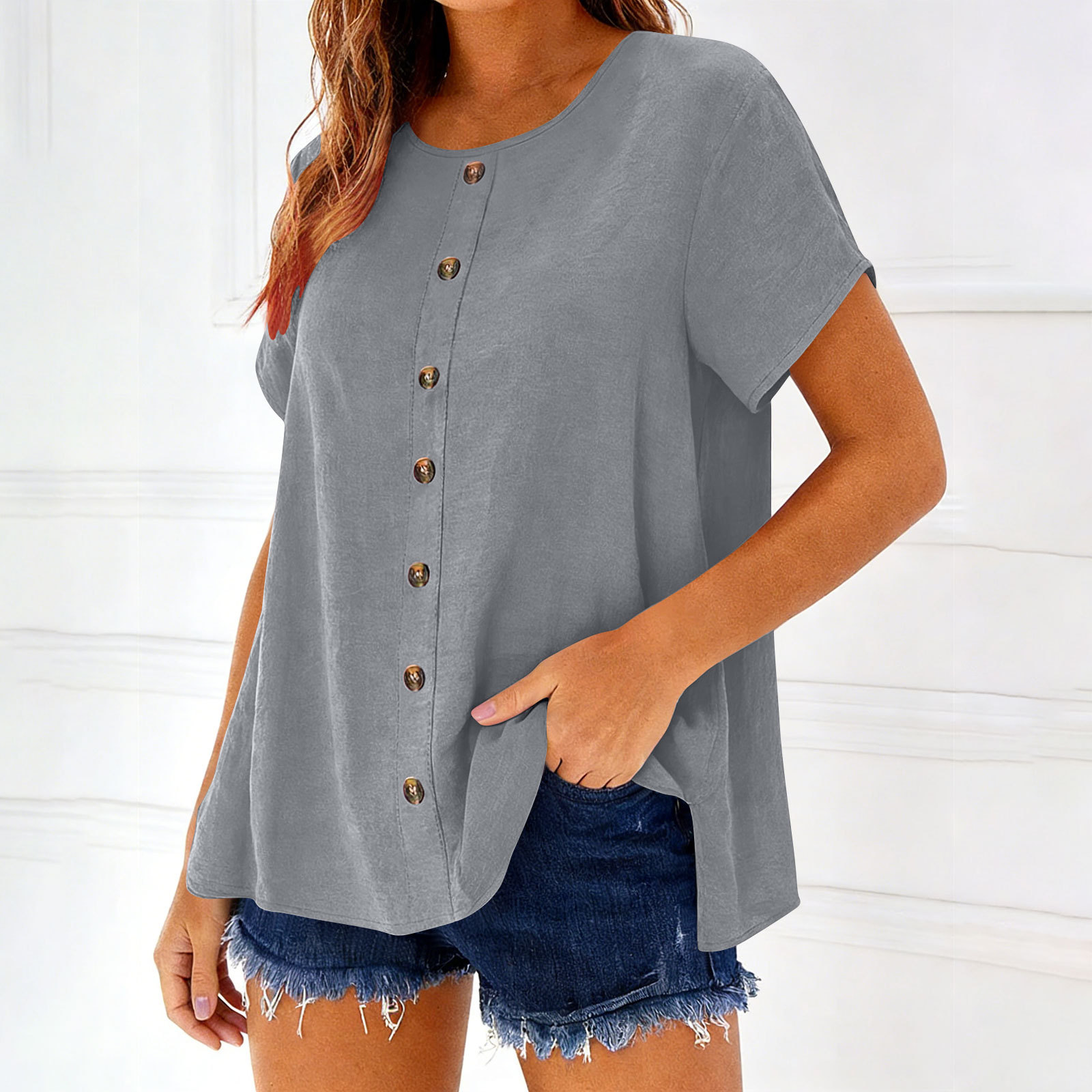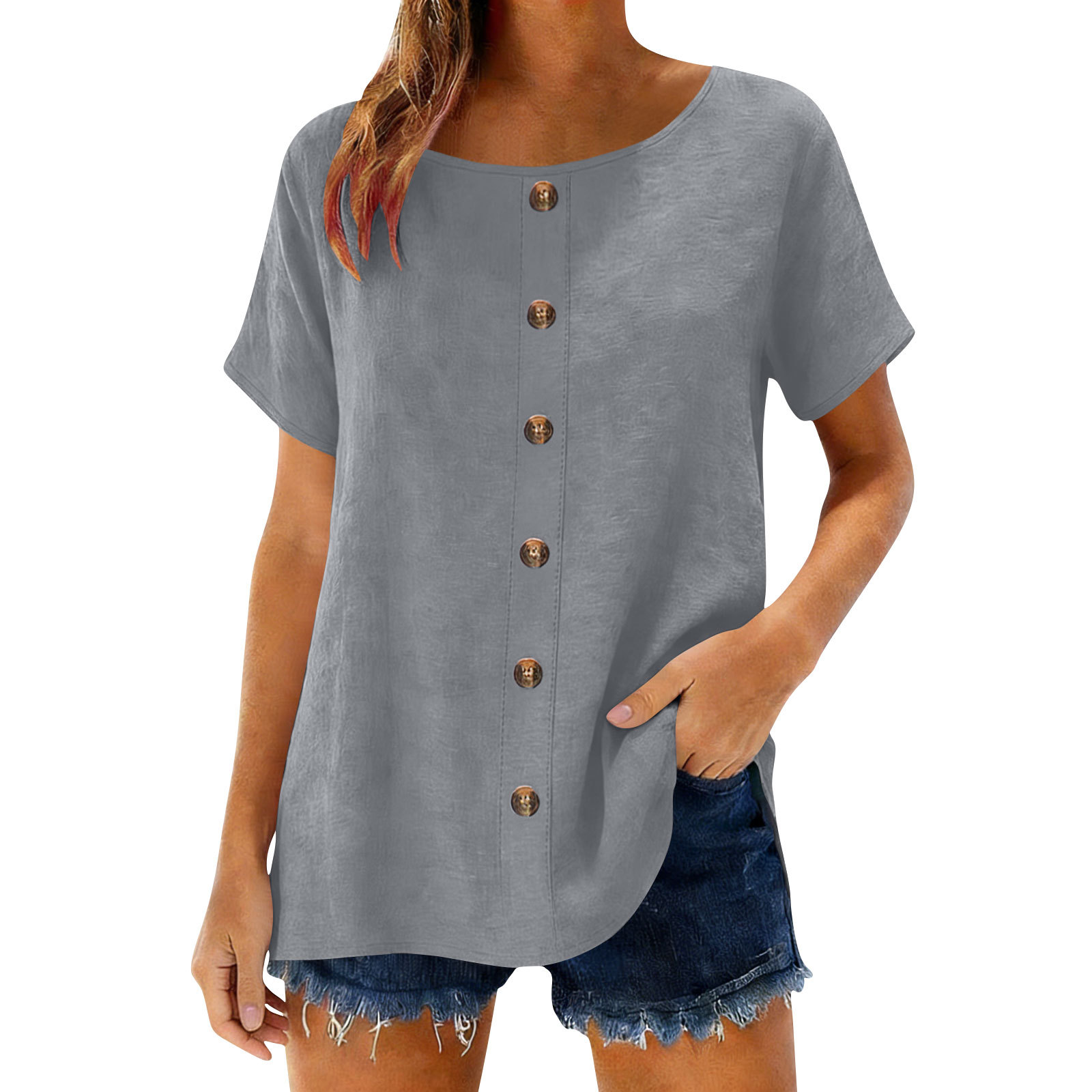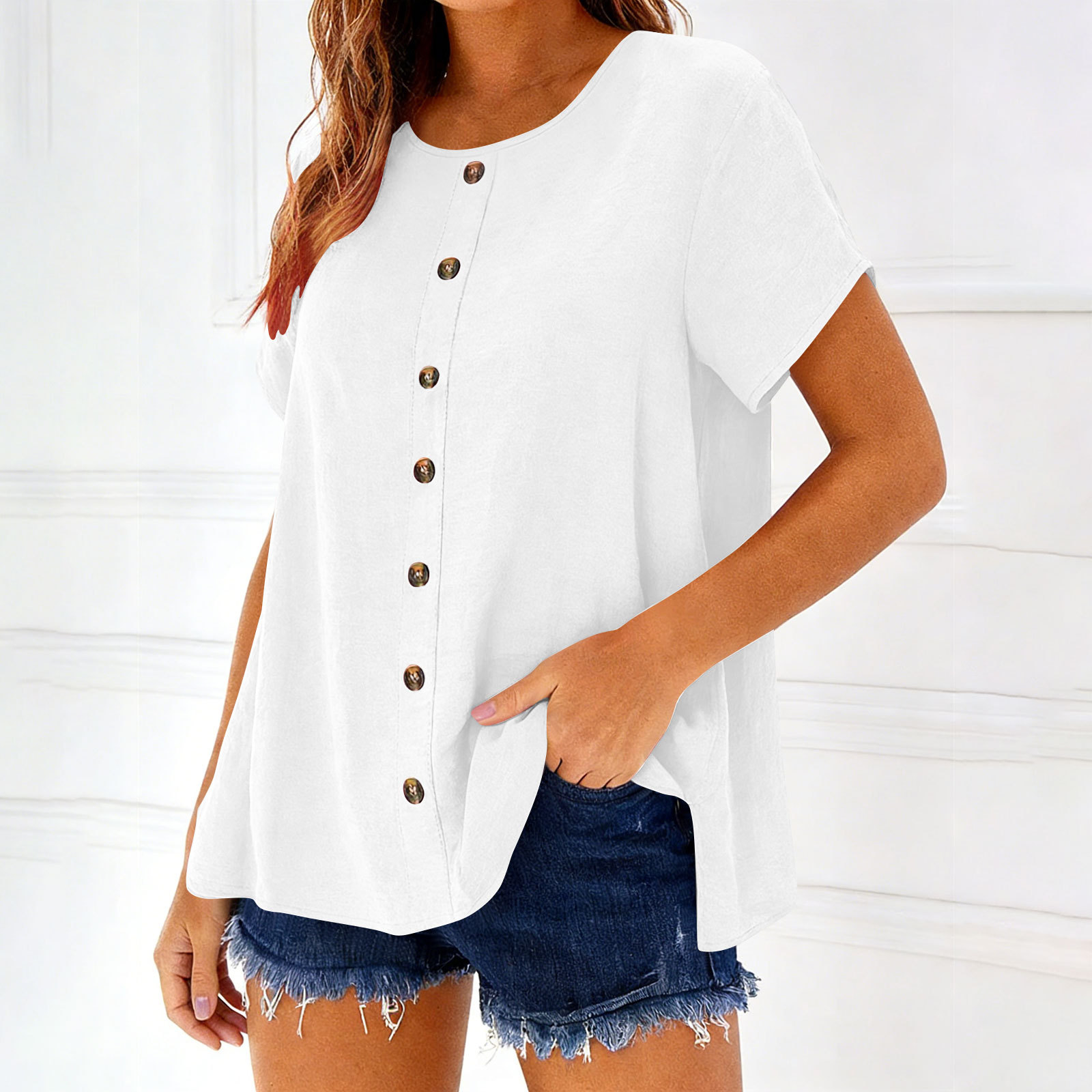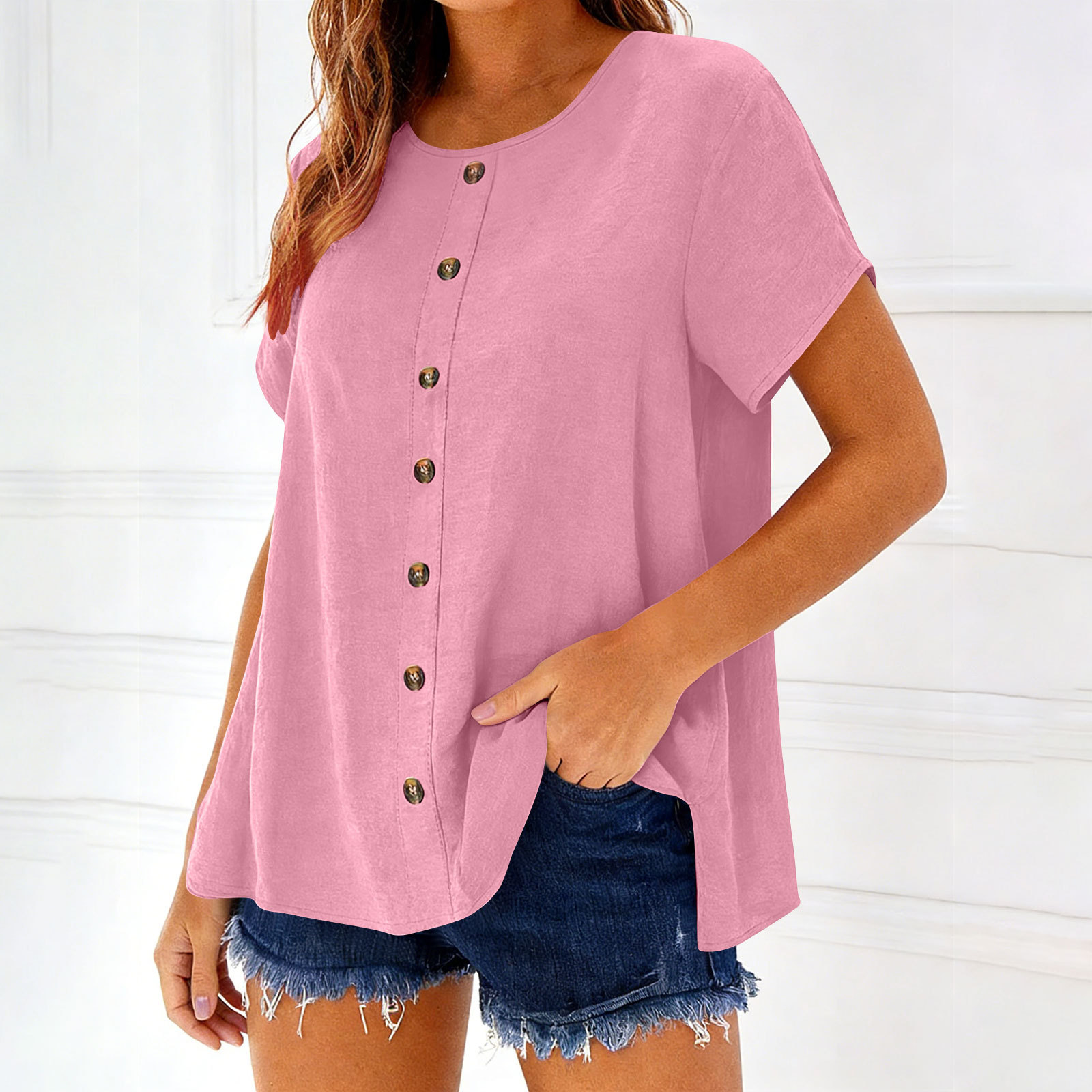 Decorative Girl Button Solid Color Short-Sleeve Crewneck T-Shirt Top