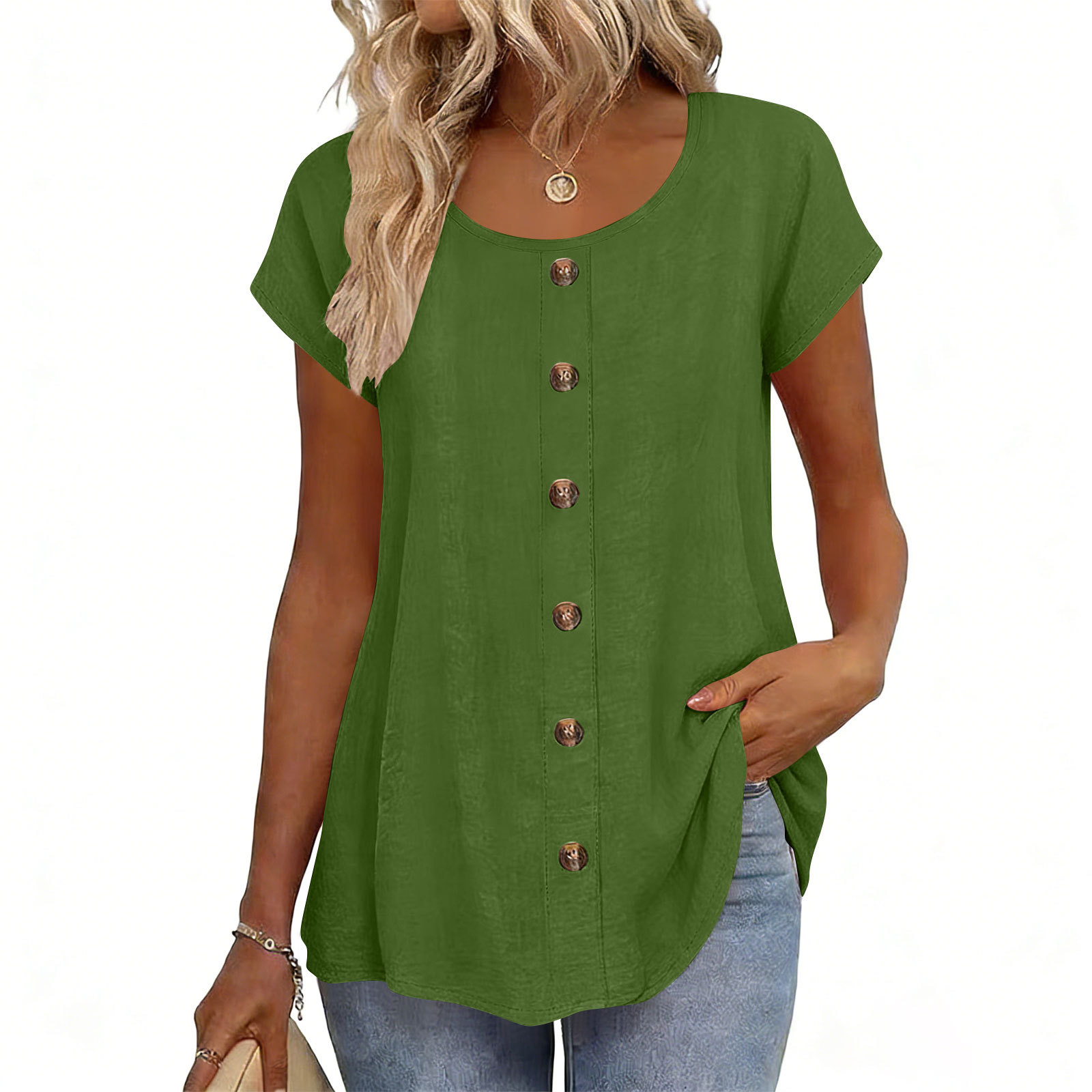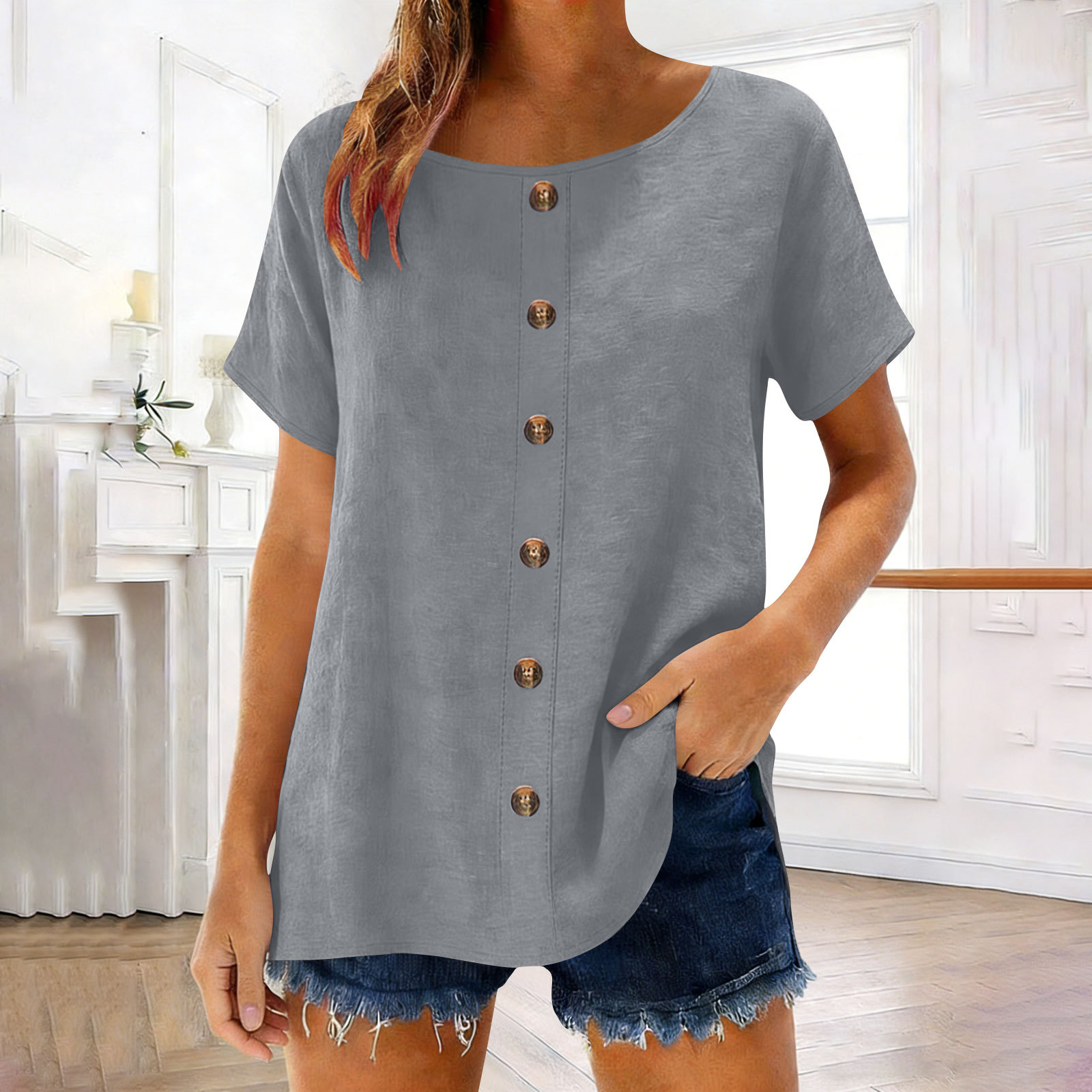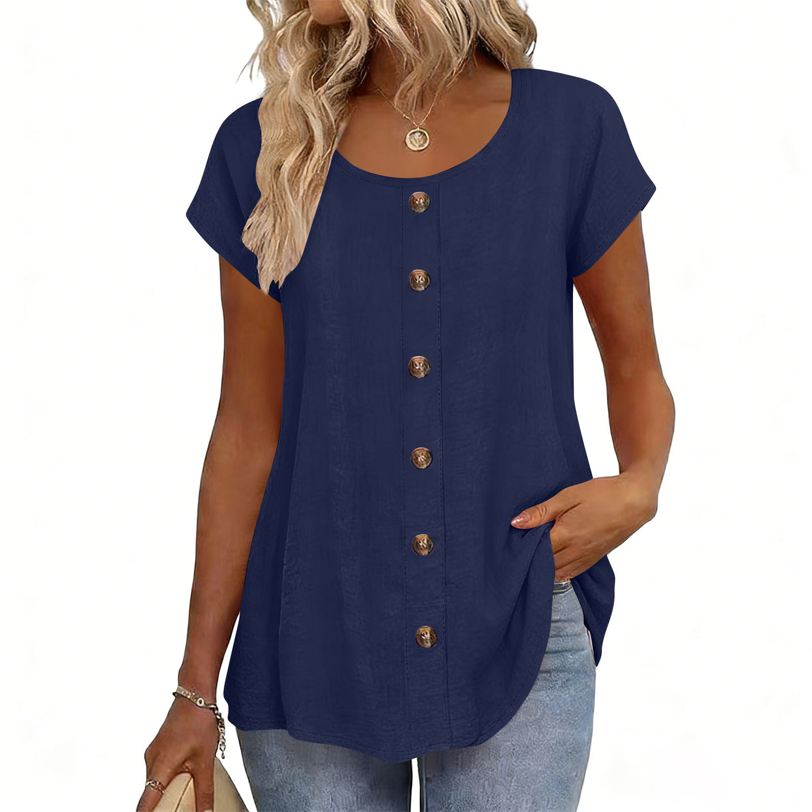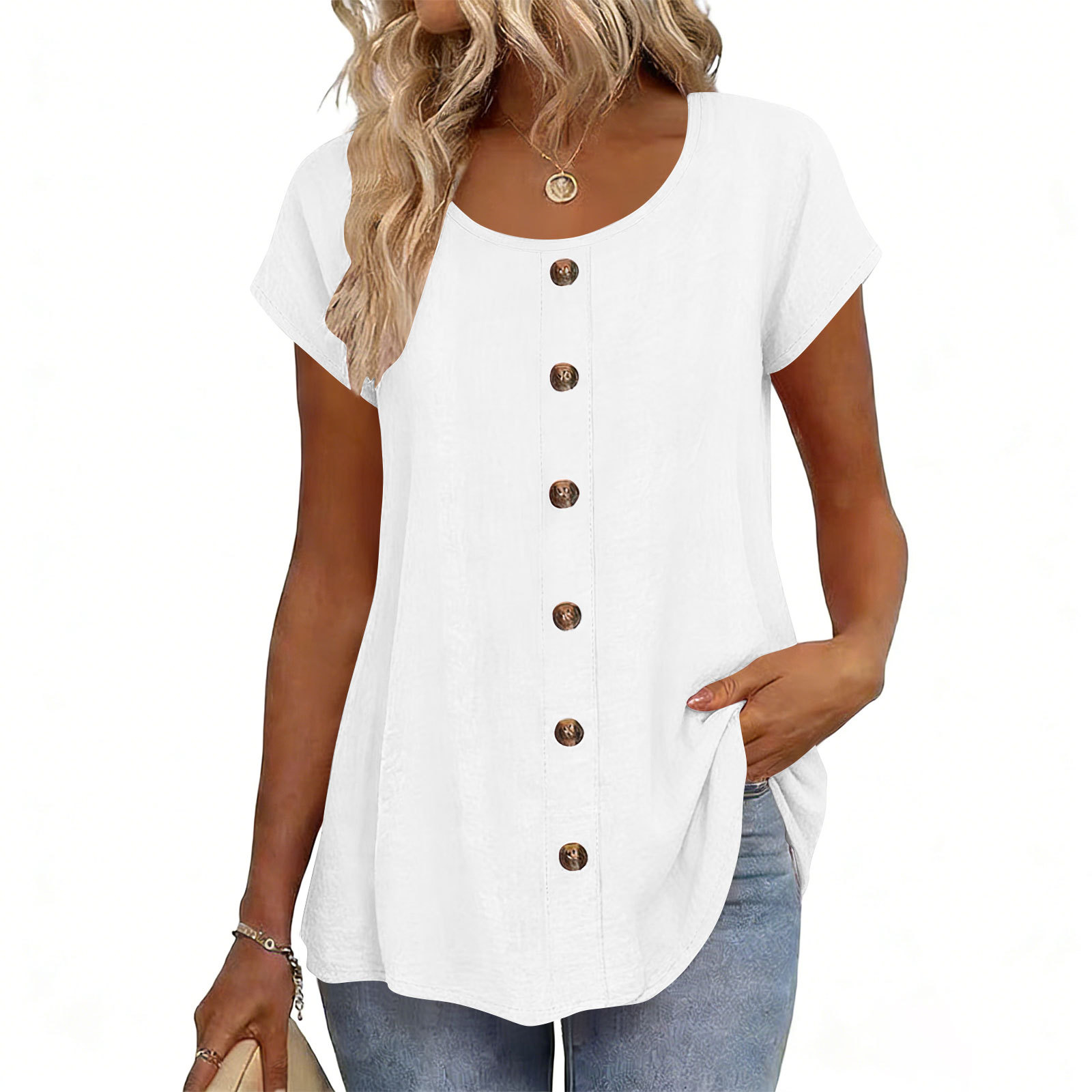 Decorative Girl Button Solid Color Short-Sleeve Crewneck T-Shirt Top