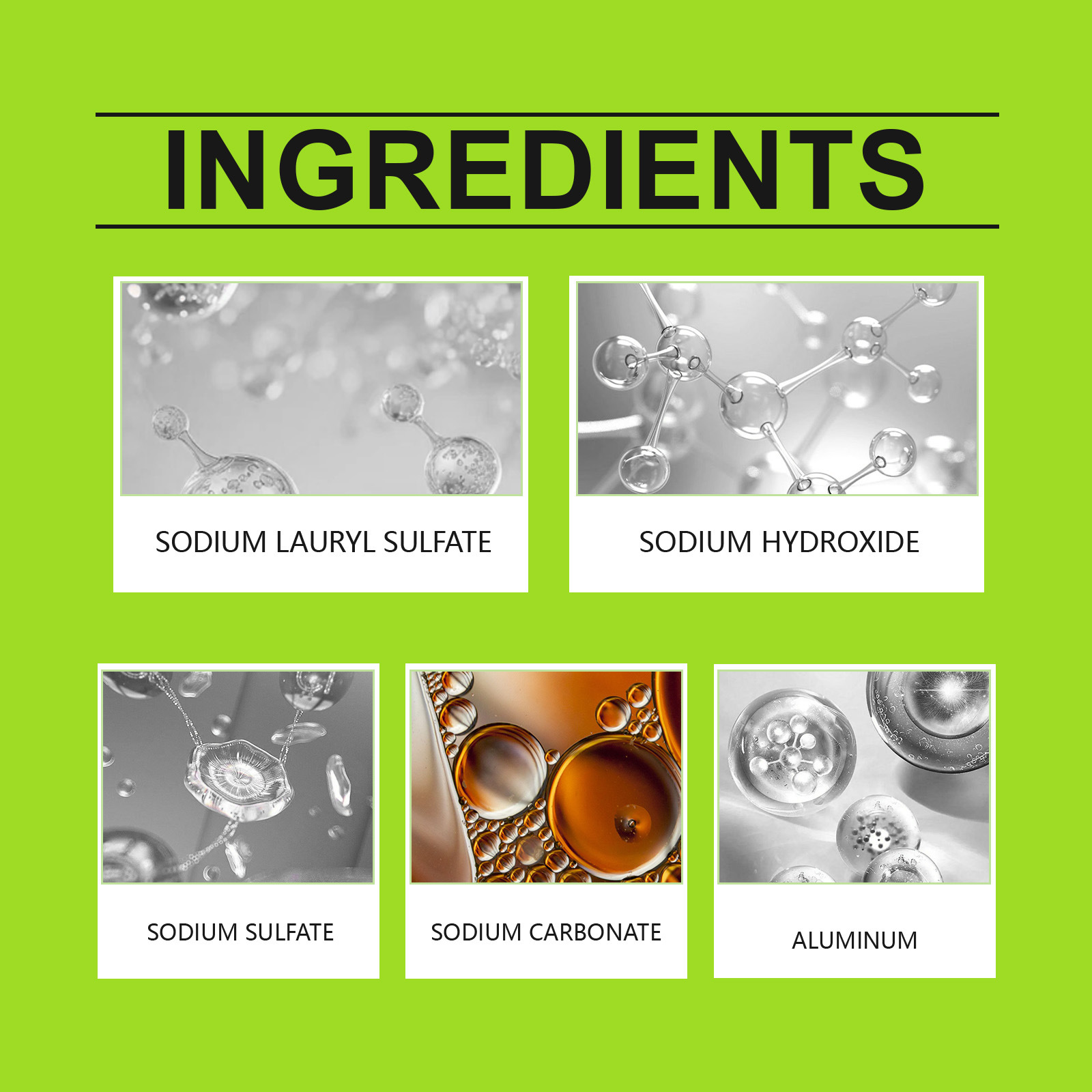 Ingredients: flake alkali, sodium sulfate, soda ash, aluminum granules, sodium lauryl sulfate.