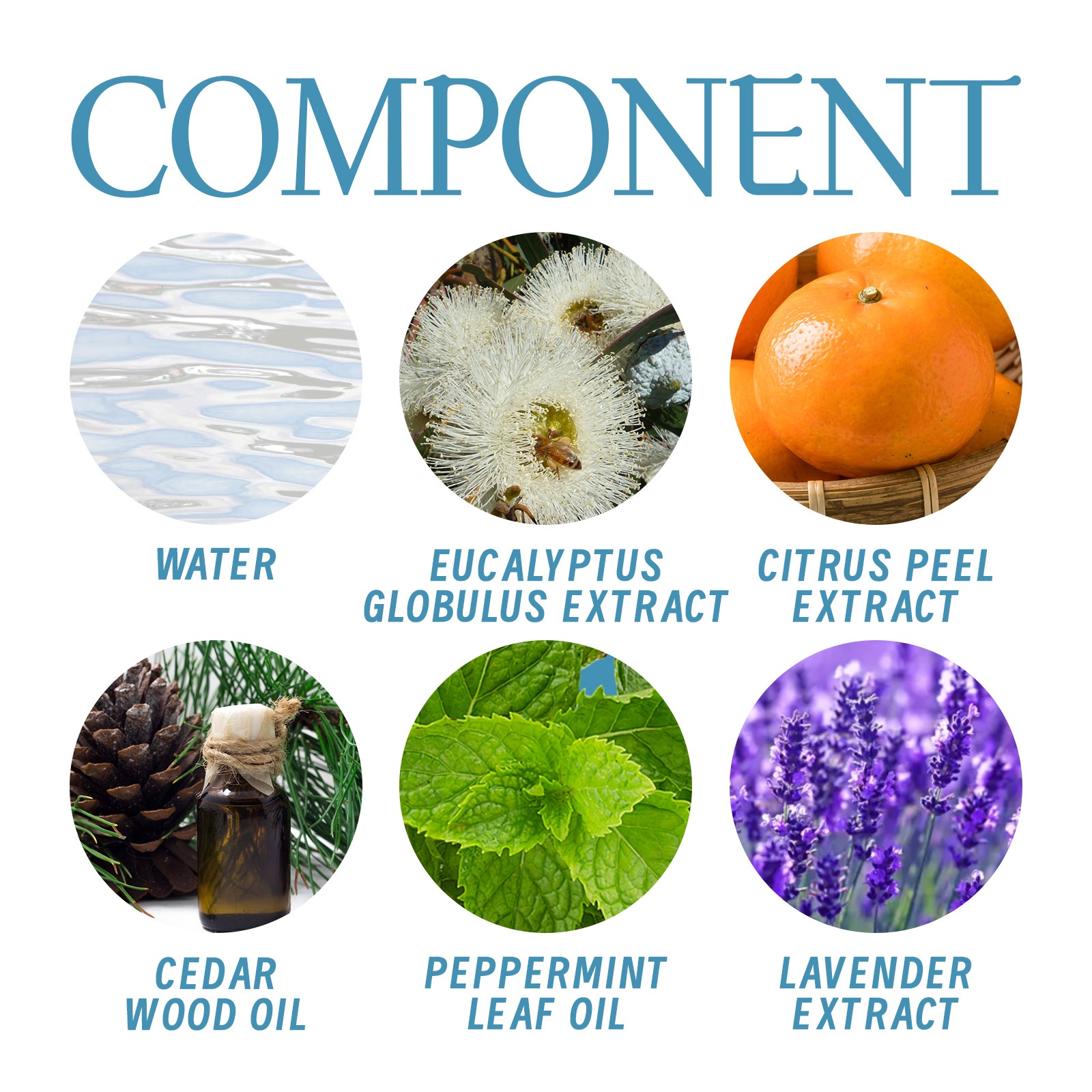 Components: Water, blue eucalyptus extract, citrus peel extract, cedar oil, mint leaf oil, lavender extract