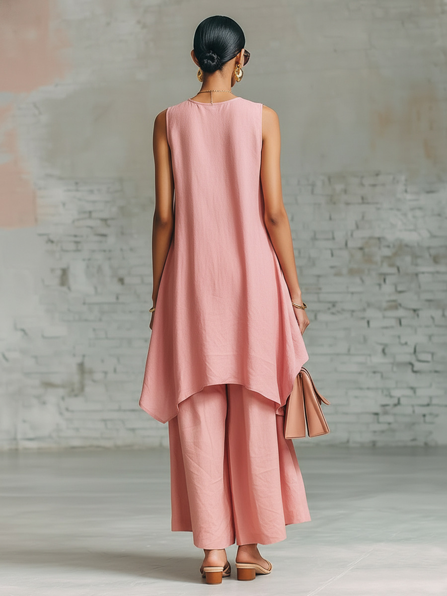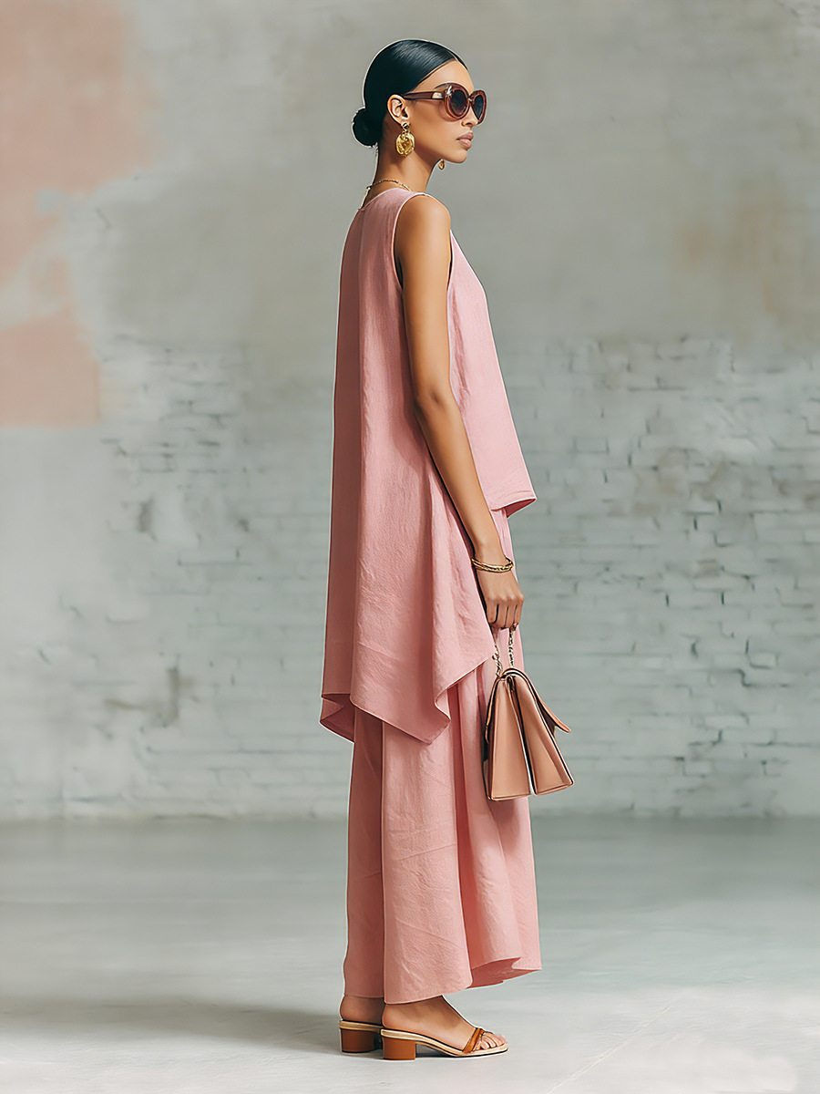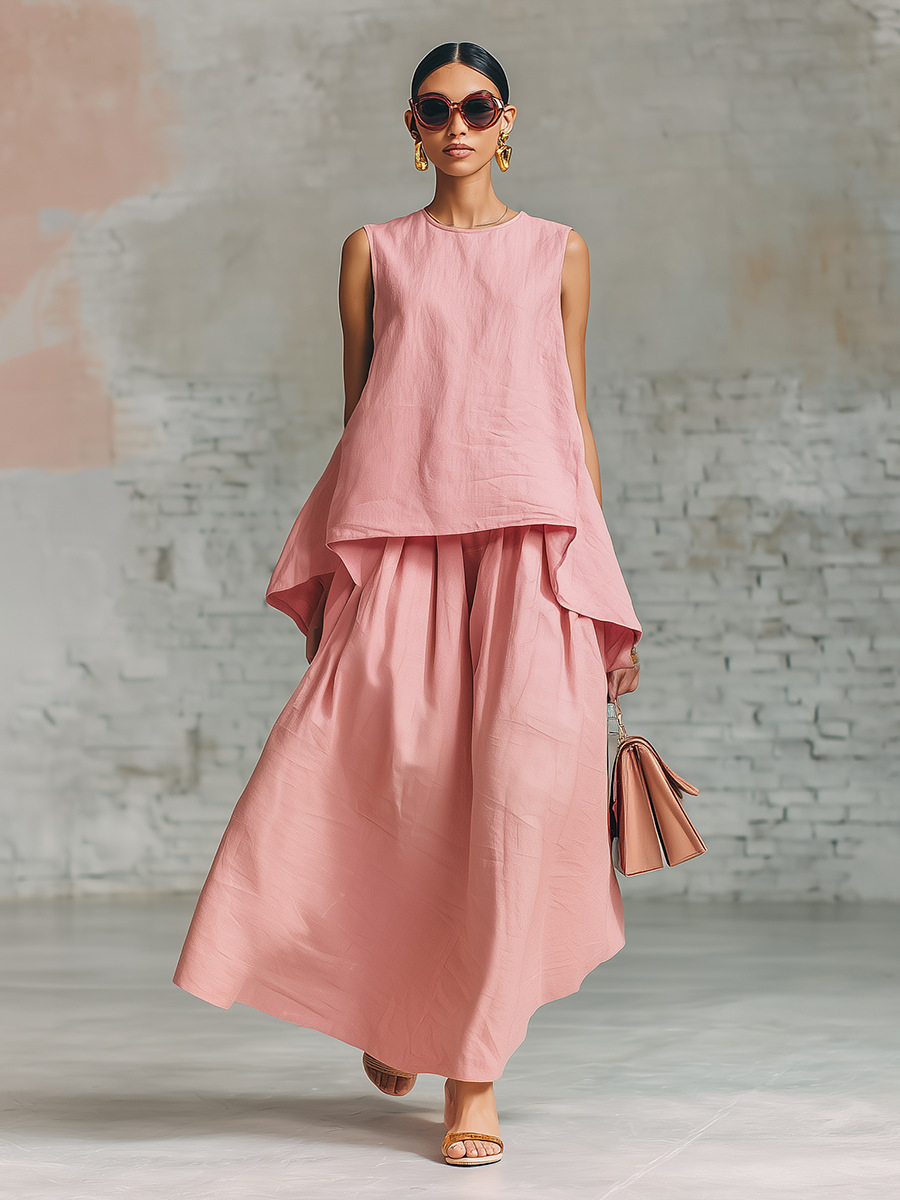 Elastic-waist Sleeveless Top With An Asymmetrical Hem And A Pleated Maxi Skirt