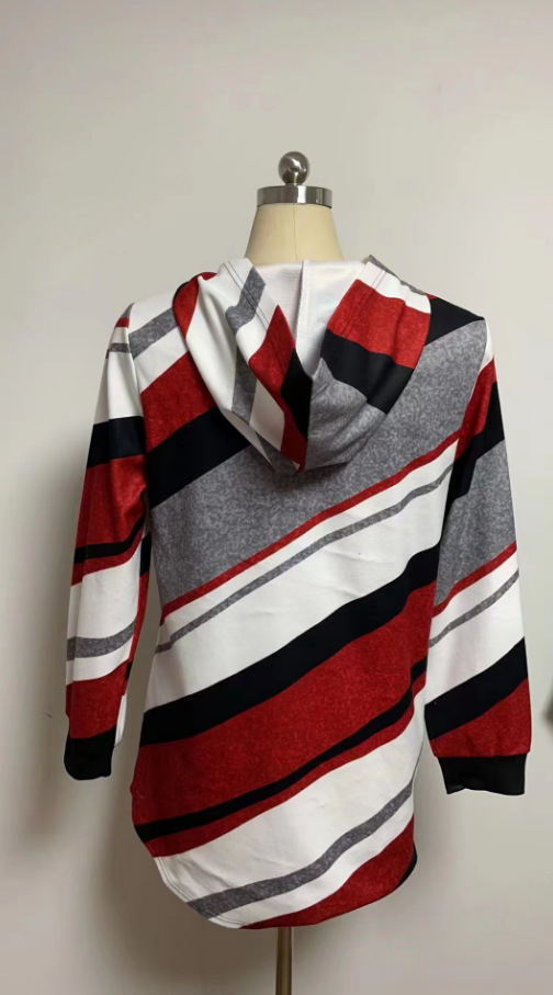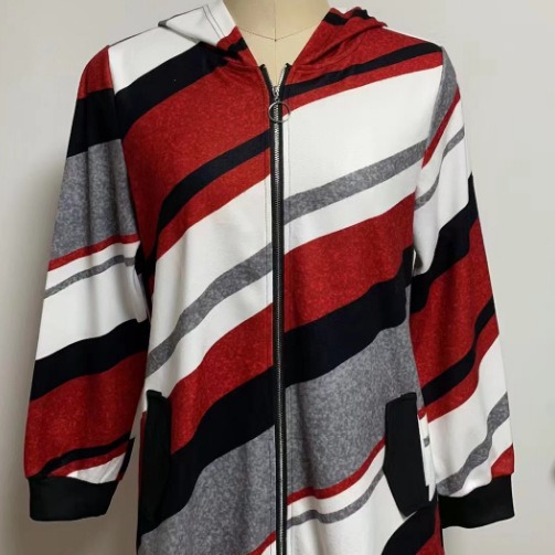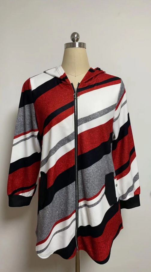 0 Review for European And American Loose Striped Hooded Zip Long Sleeve Coat