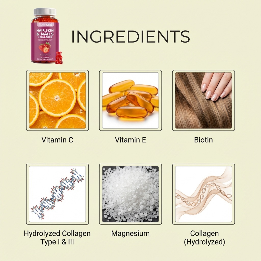 Ingredients: vitamin C, vitamin E, biotin, hydrolyzed collagen I&III, magnesium, collagen (hydrolyzed).