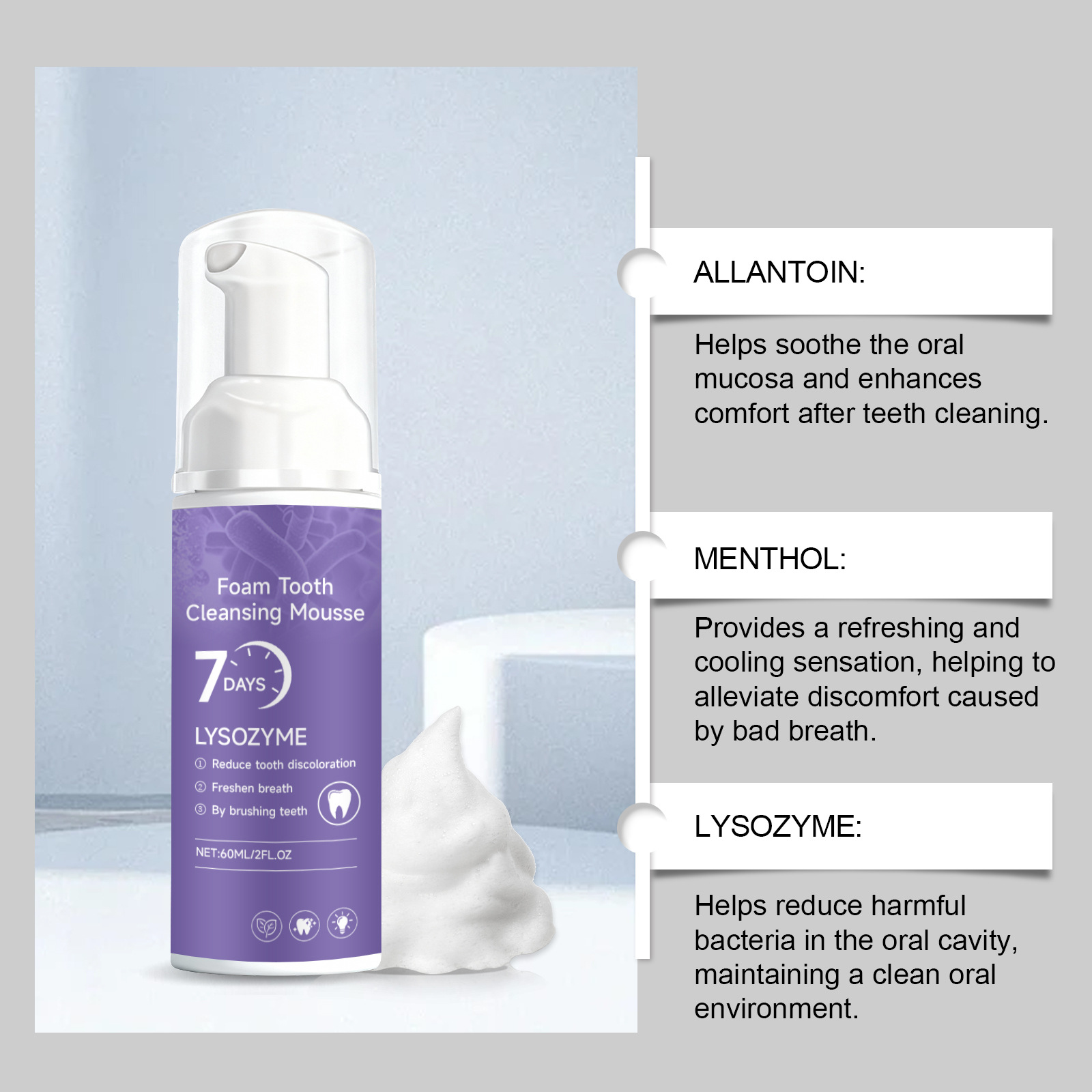 Ingredients: water, hydroxyapatite, glycerin, decyl glucoside, 1,2- hexanediol, allantoin, menthol, lysozyme.