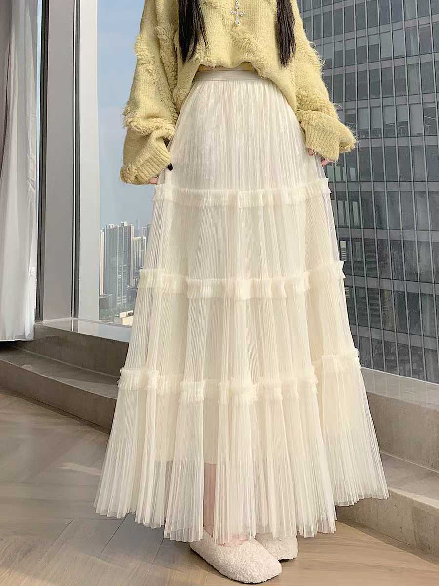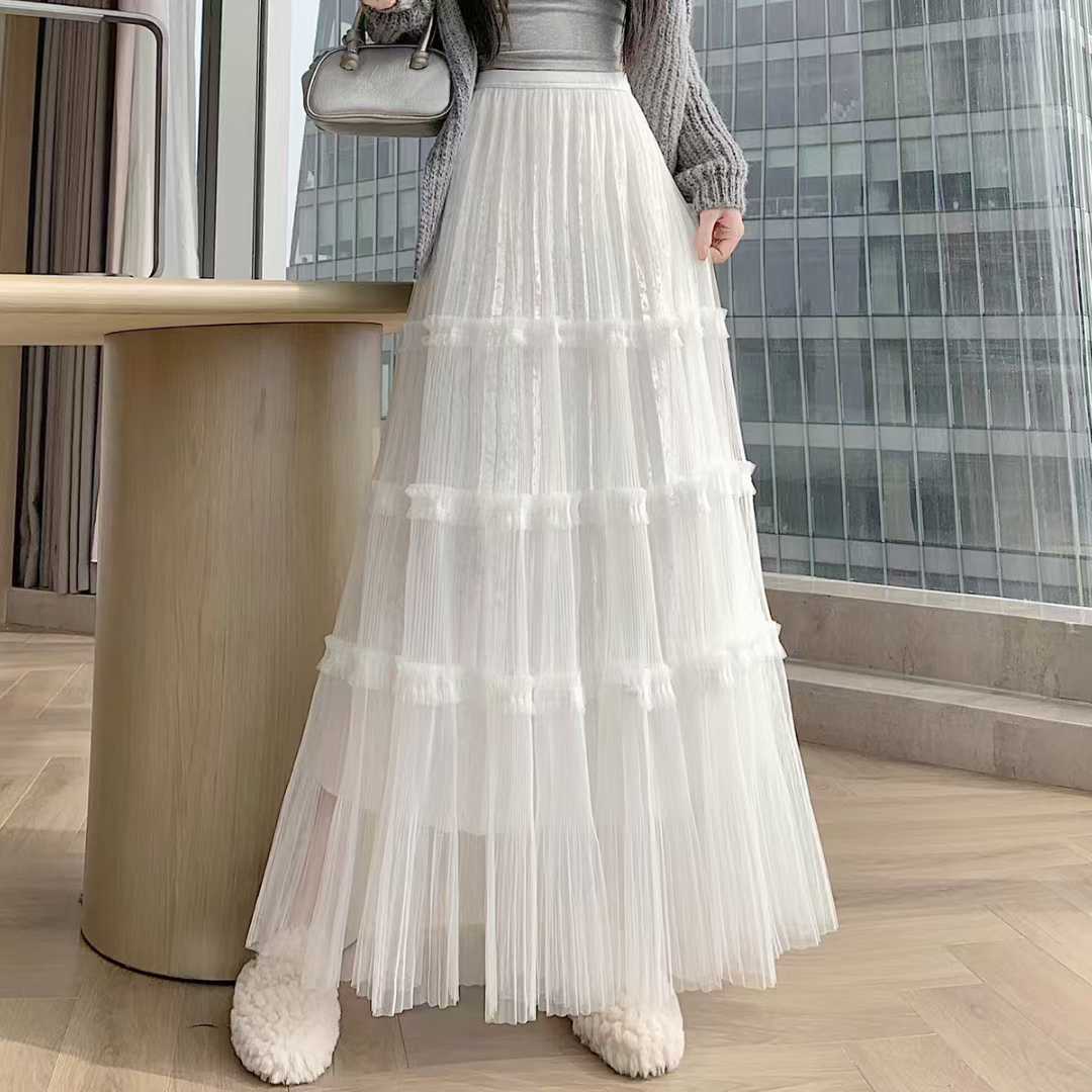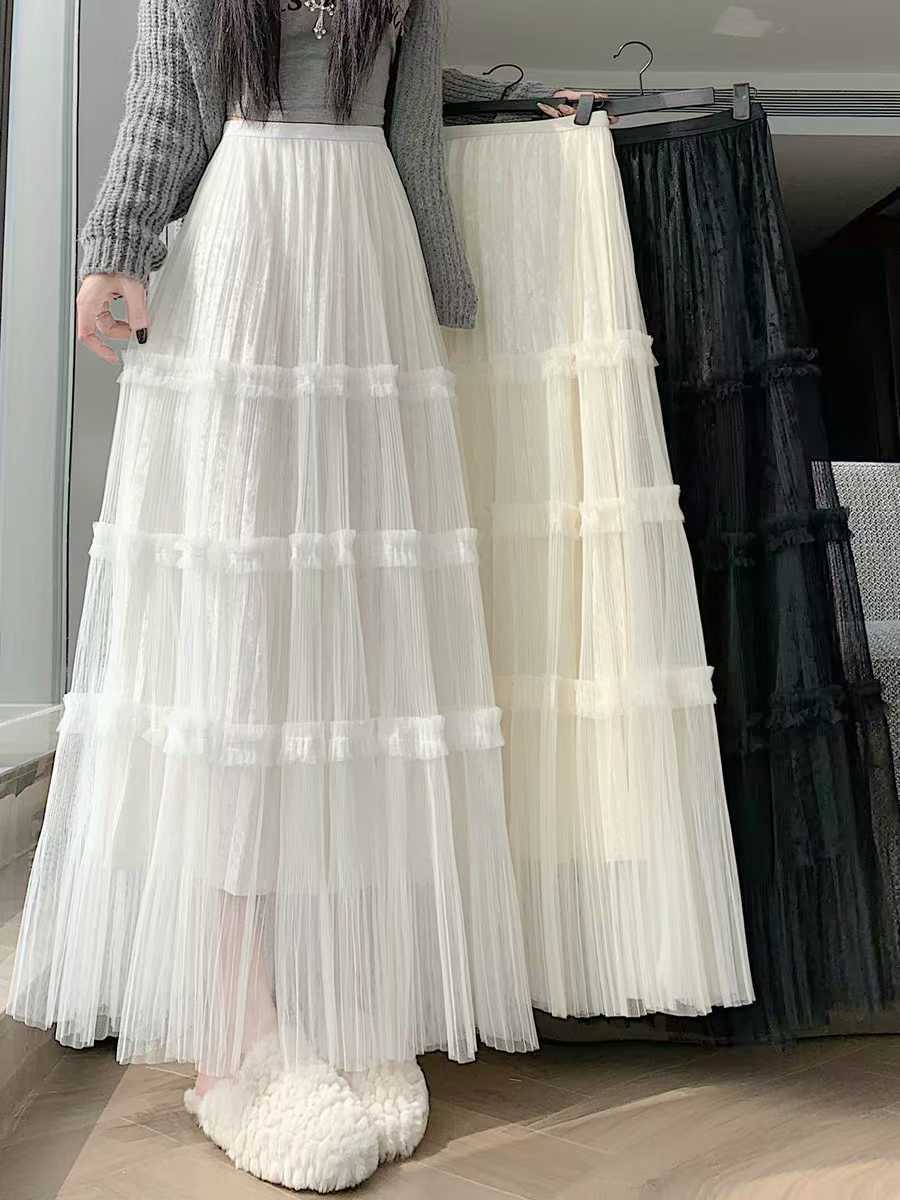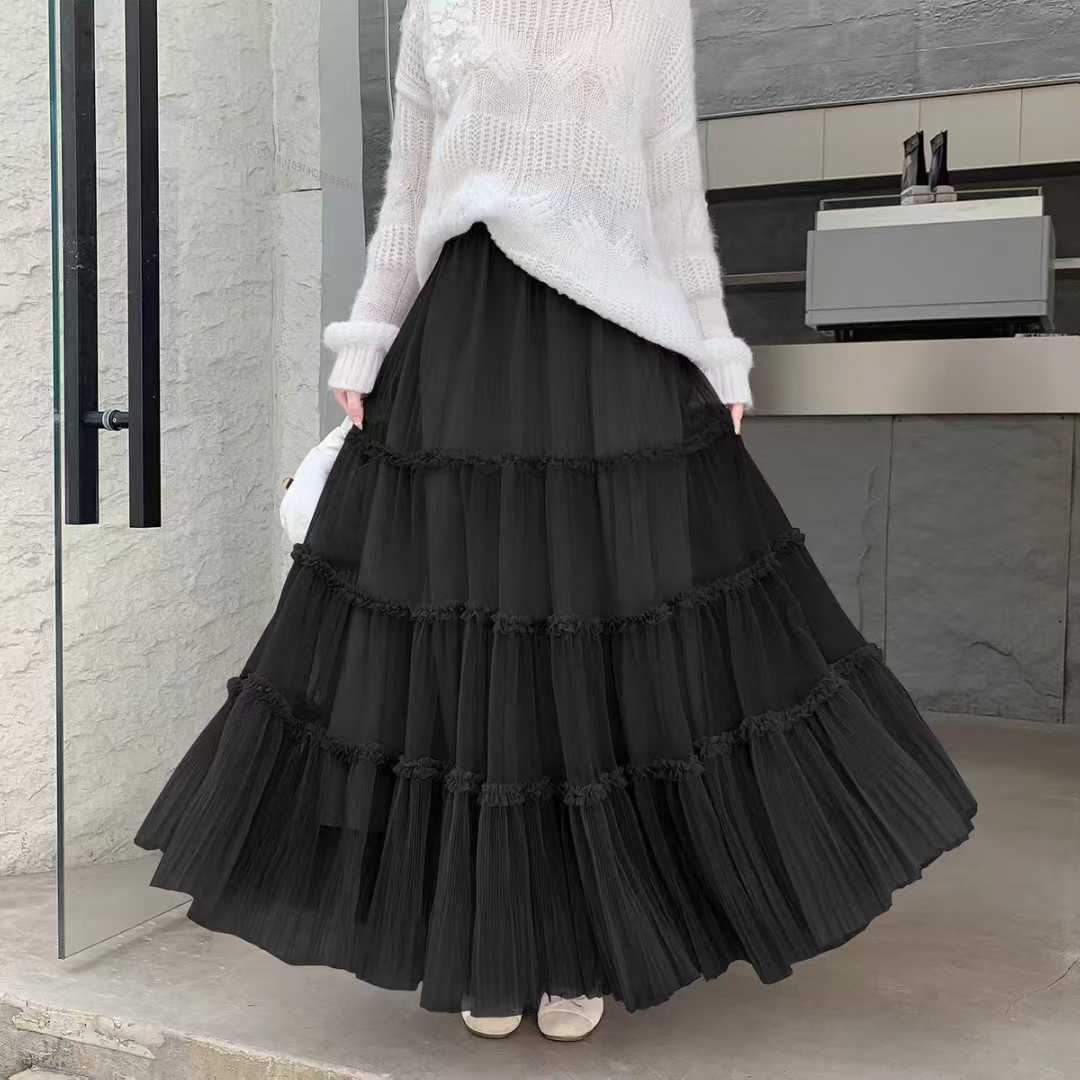 0 Review for French-style Ruffled Mesh Panel Puffy Skirt
