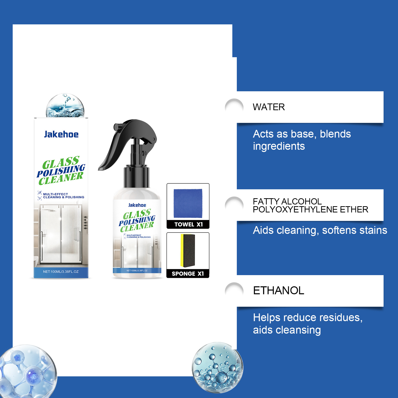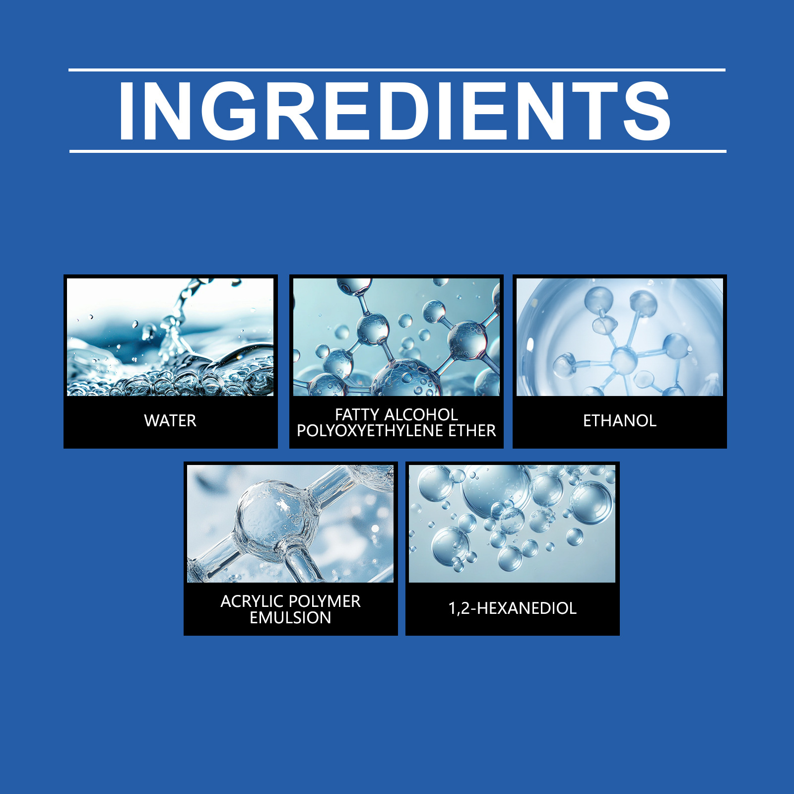 Ingredients: water, fatty alcohol polyoxyethylene ether, ethanol, acrylic polymer emulsion, 1,2- hexanediol.