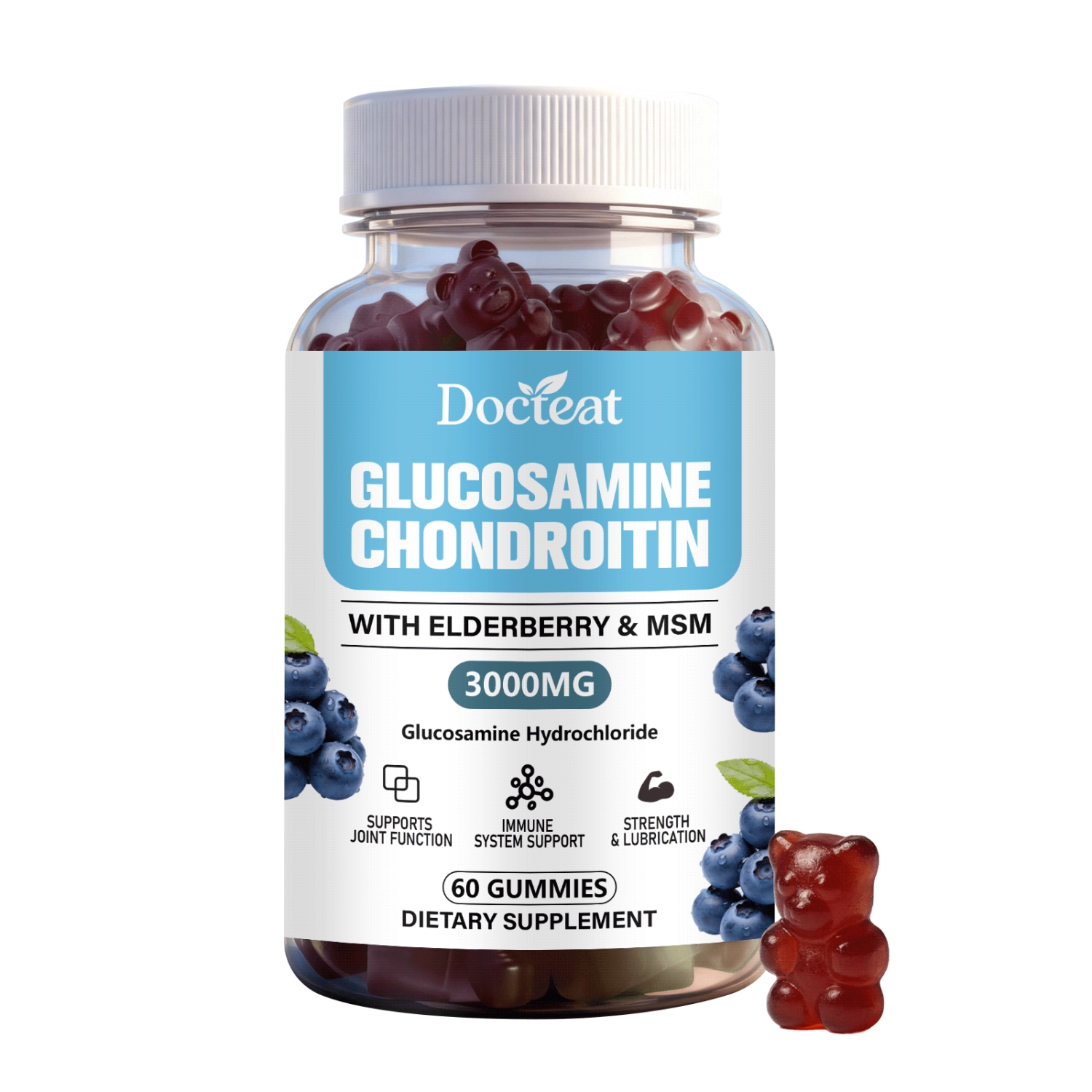 Ingredients: glucosamine hydrochloride, chondroitin sulfate sodium, methylsulfonylmethane, calcium fructose borate, hyaluronic acid, elderberry extract, turmeric extract.