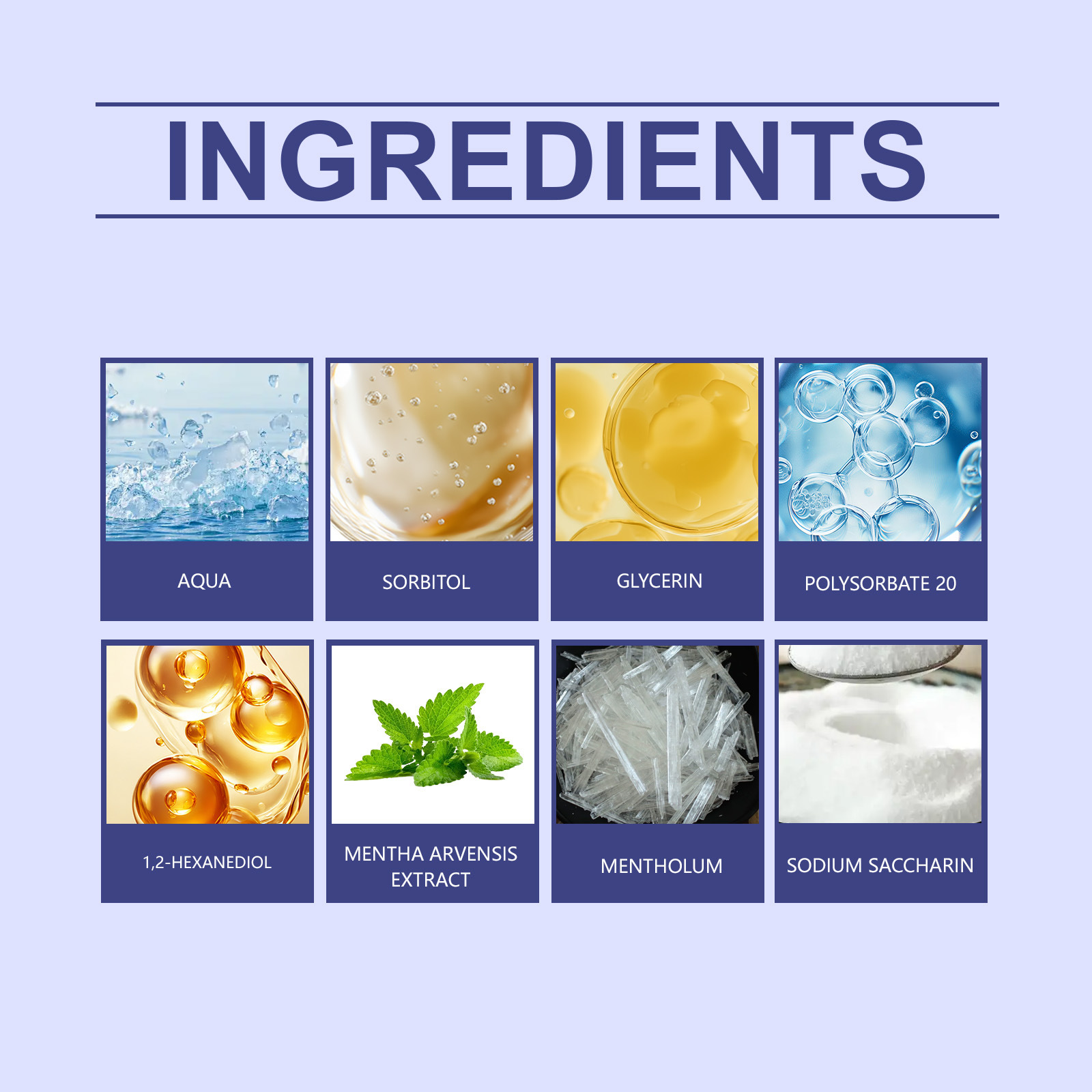 Ingredients: water, sorbitol, glycerol, 1,2- hexanediol, polysorbate -20, menthol, saccharin sodium and mint extract.