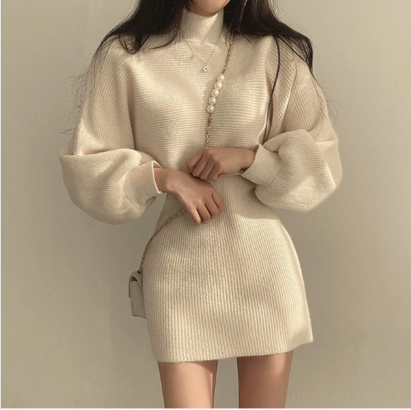 Lantern-sleeve Knitted Sweater Cropped Versatile Dress Set For Women