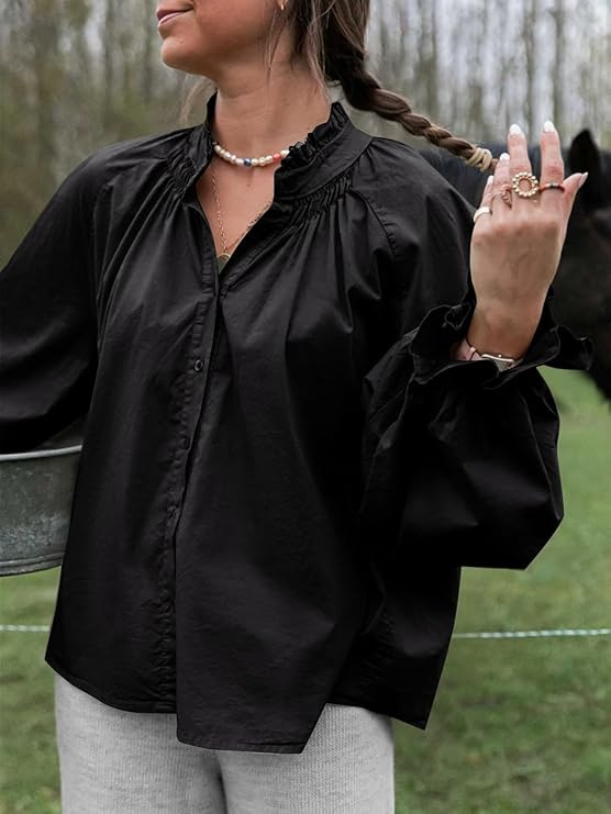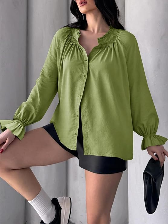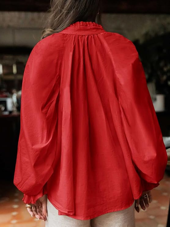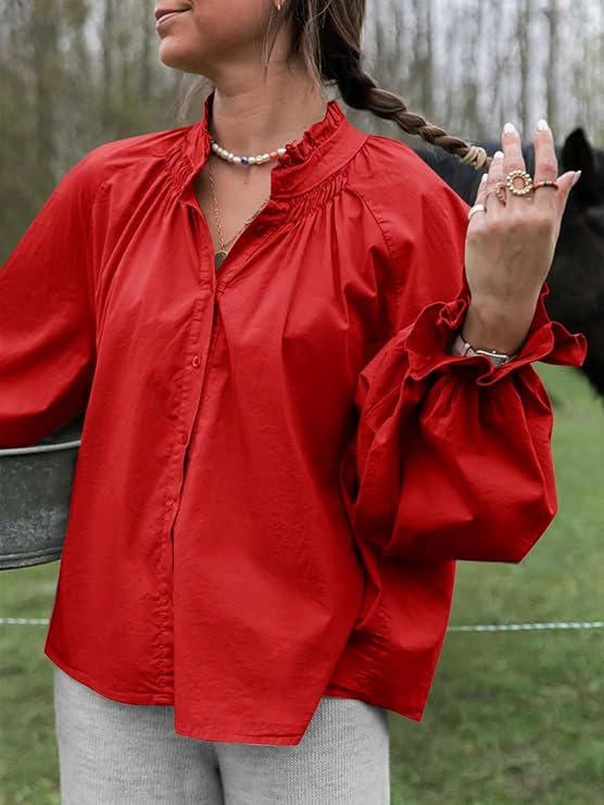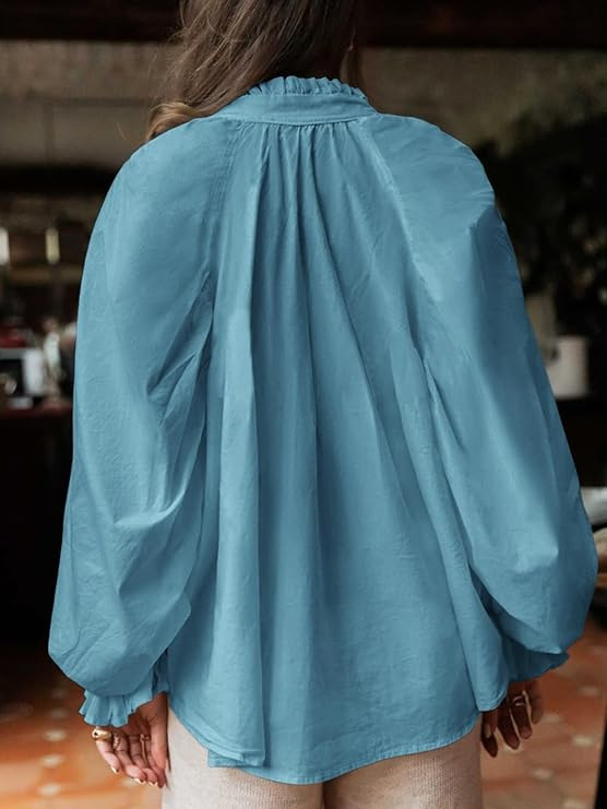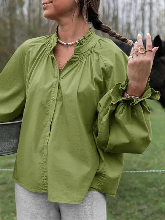 0 Review for Lantern-sleeve V-neck Ruffled Blouse Top