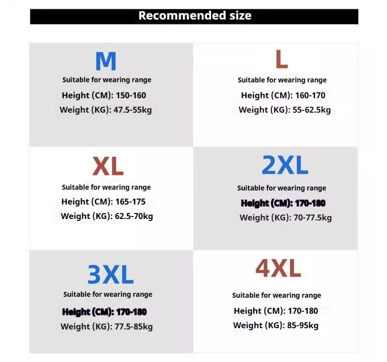 Sizes: S (80–90 jin), M (90–105 jin), L (105–120 jin), XL (120–135 jin), 2XL (135–150 jin), 3XL (150–165 jin), 4XL (165–180 jin)