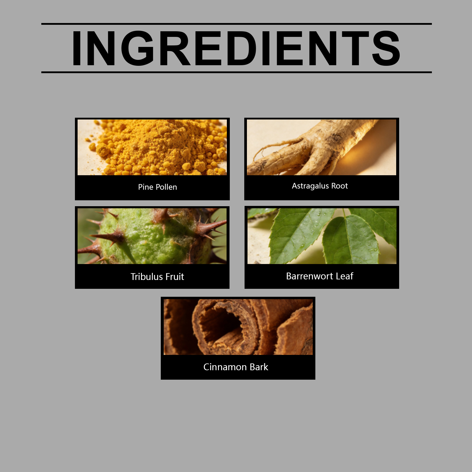Ingredients: pine pollen, astragalus root, tribulus terrestris fruit, epimedium leaves, cinnamon.