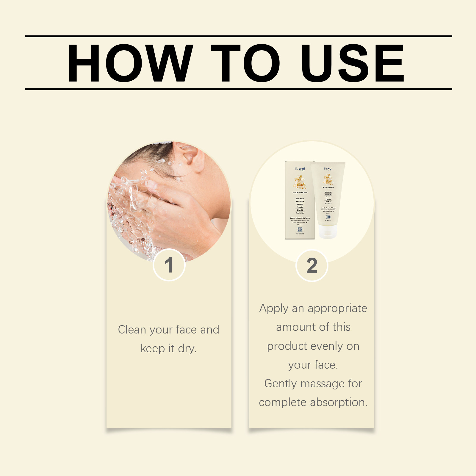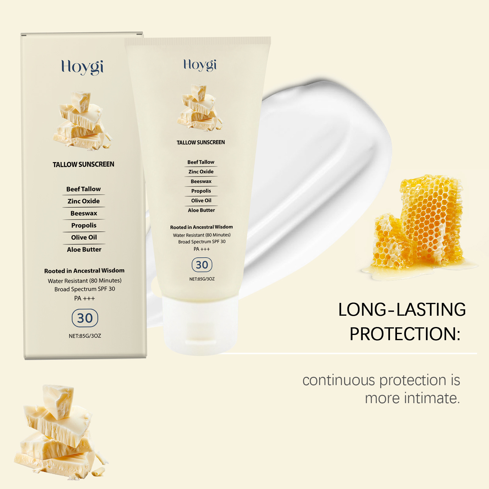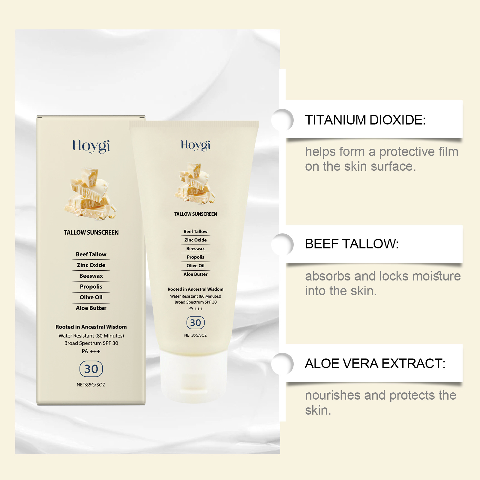 Ingredients: Water, titanium dioxide, ethyl hexyl methoxycinnamate, isononyl isonononate, Glyceryl stearate, 1,2-hexanediol, tallow, zinc oxide, beeswax, propolis, olive oil, aloe extract