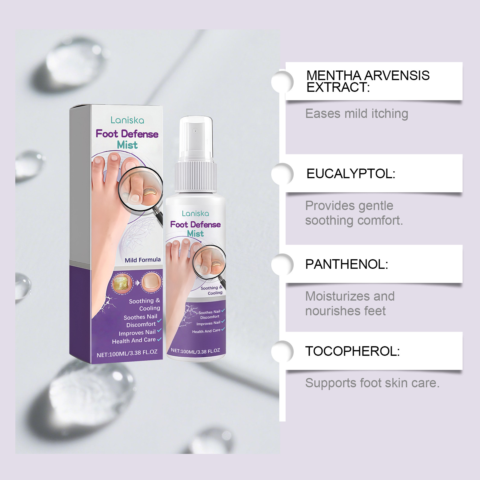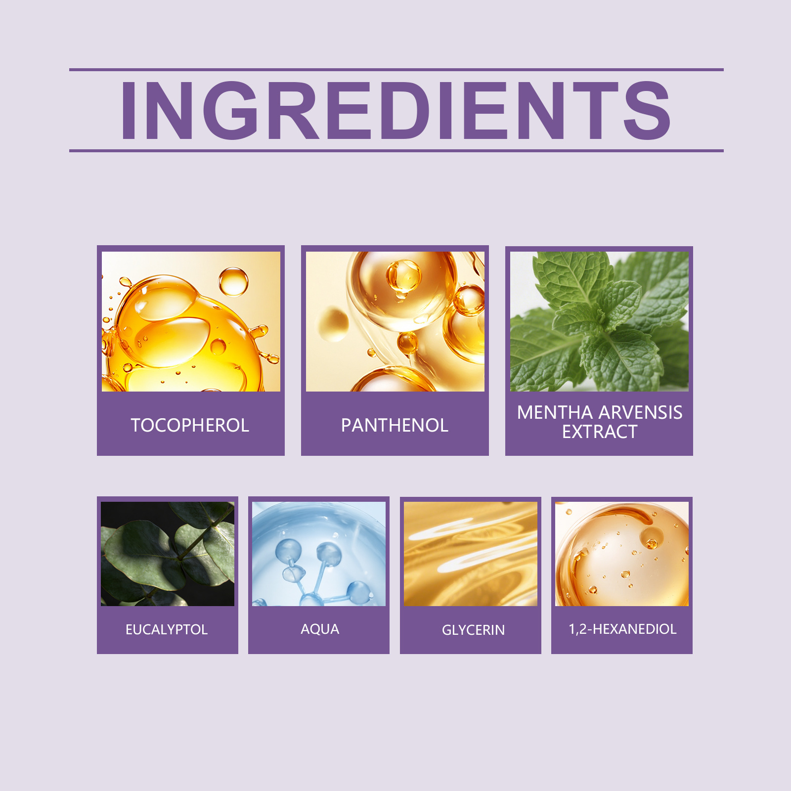 Active ingredients: Tocopherol (Vitamin E), Panthenol, Field Mint Extract, Eucalyptol