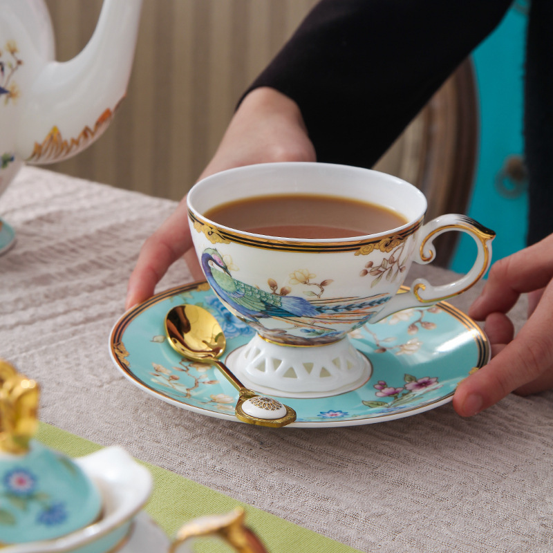 Color: purple-hundred birds blessing cup and saucer, blue-hundred birds blessing cup and saucer, jade cup and saucer