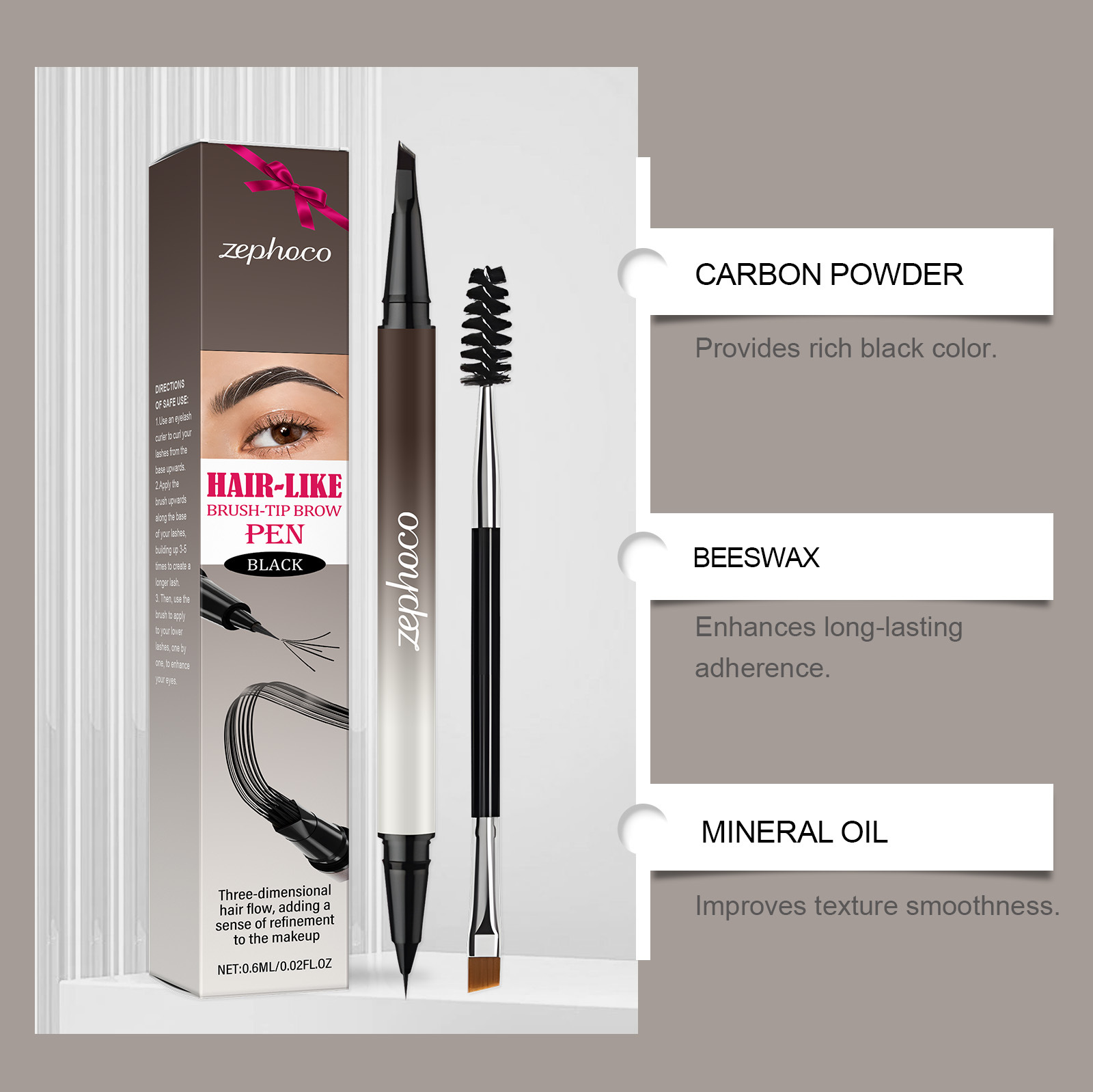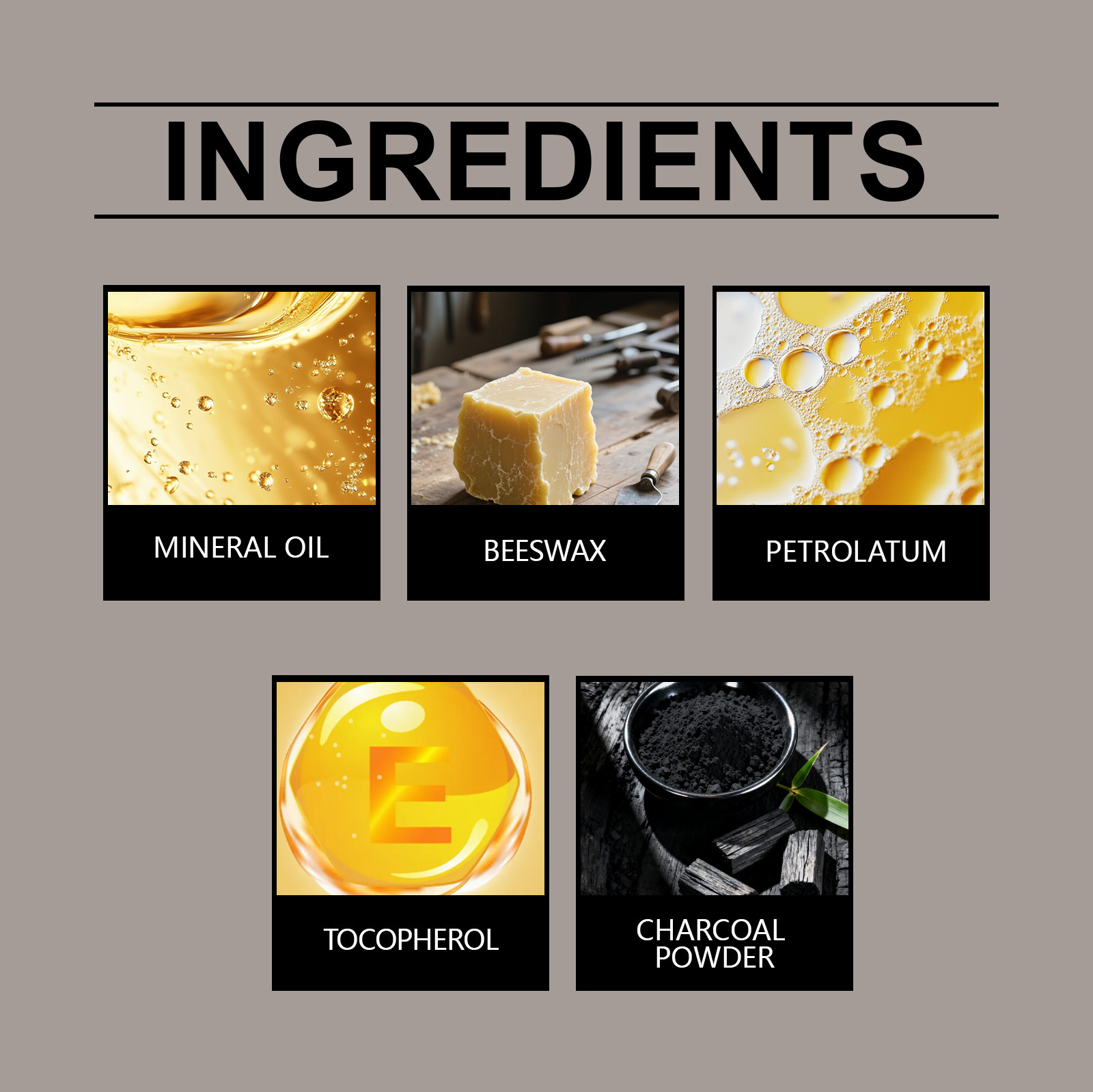 Ingredients: mineral oil, beeswax, petrolatum, tocopherol (vitamin E), carbon powder, titanium dioxide.