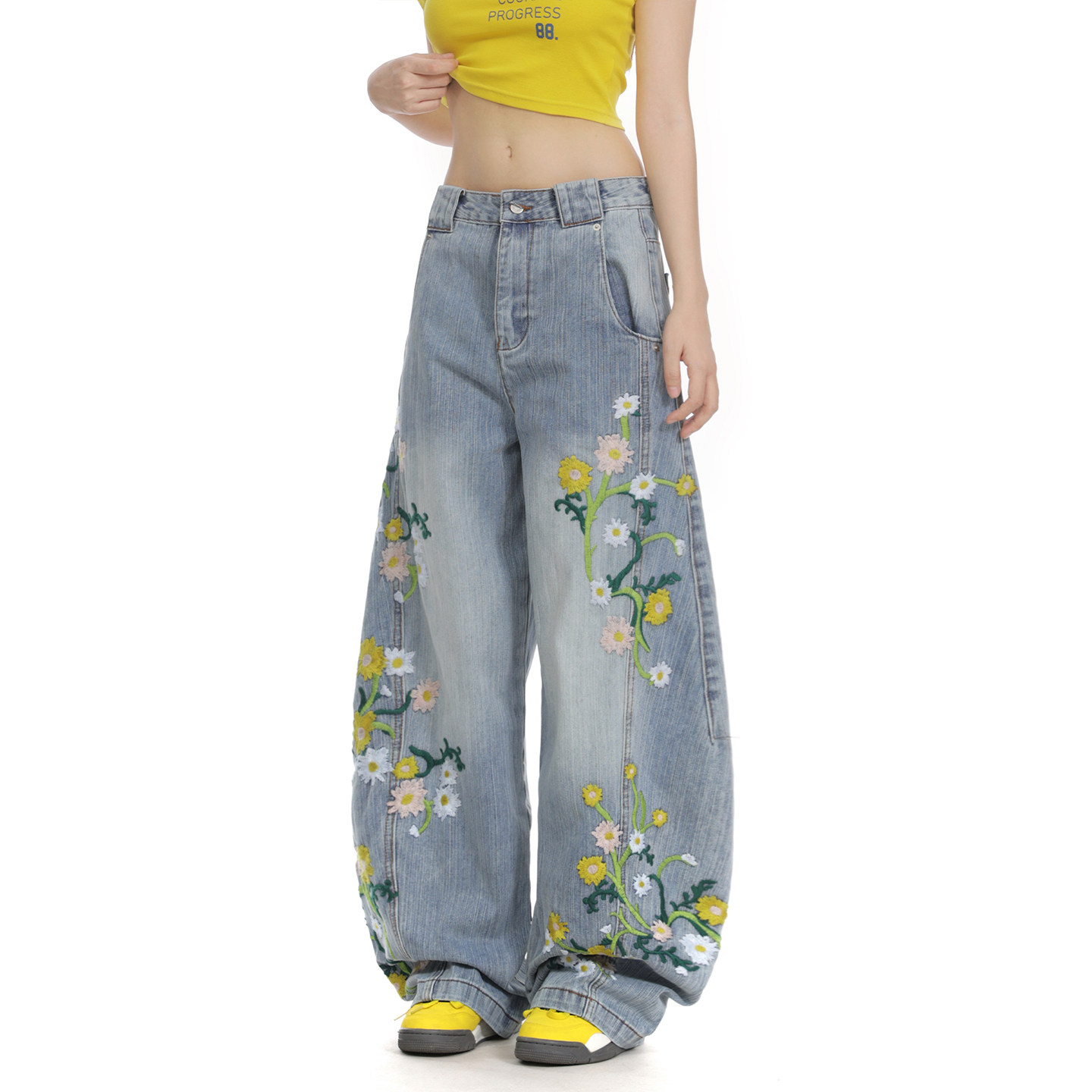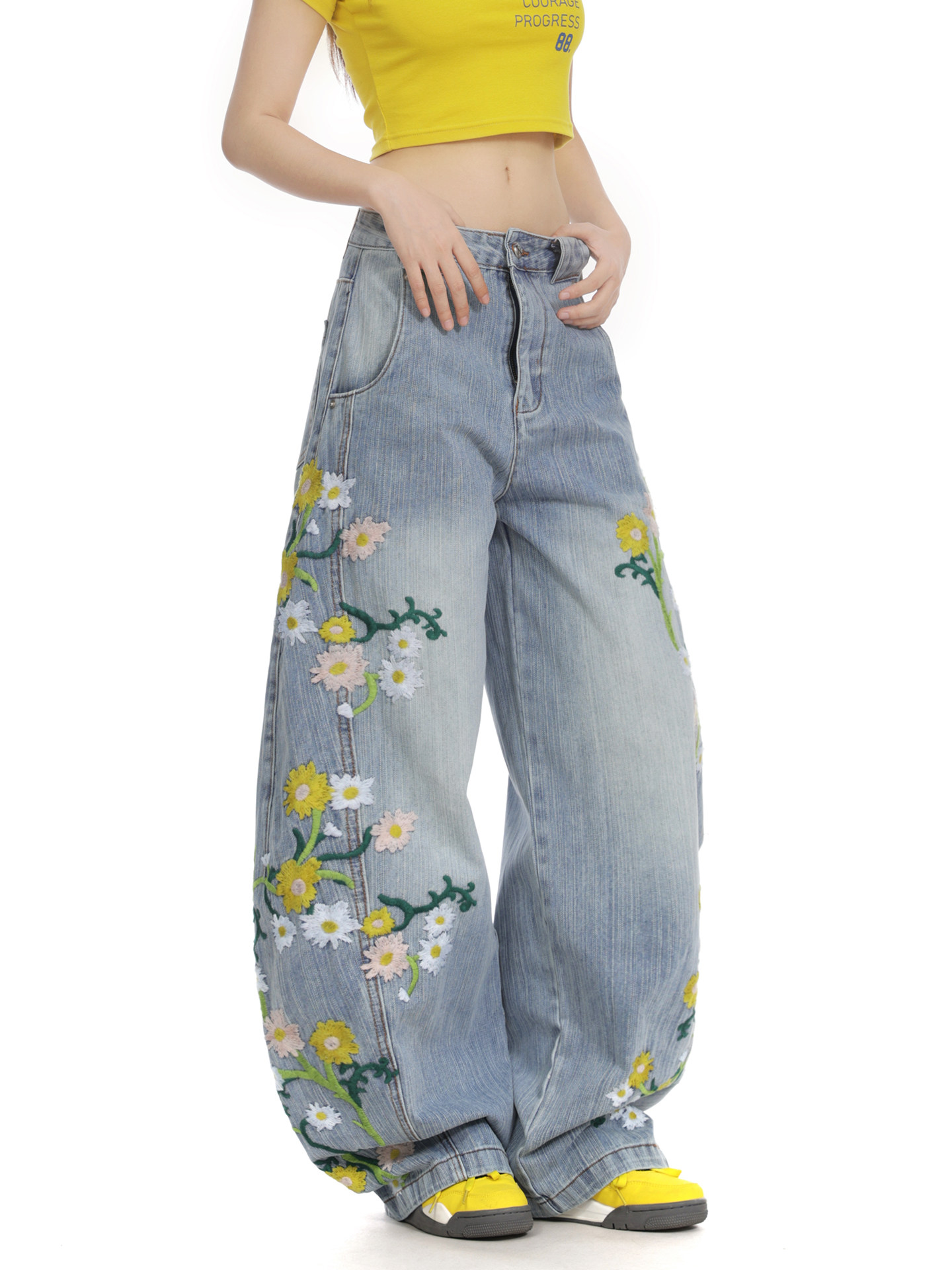 0 Review for Plant And Floral Embroidered Curved Jeans