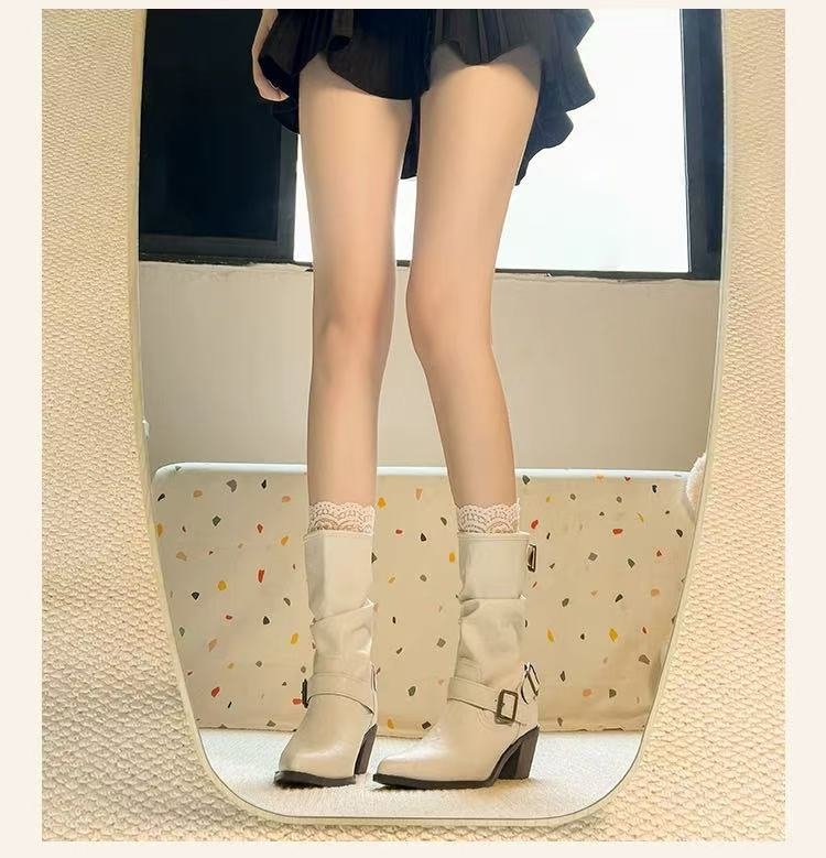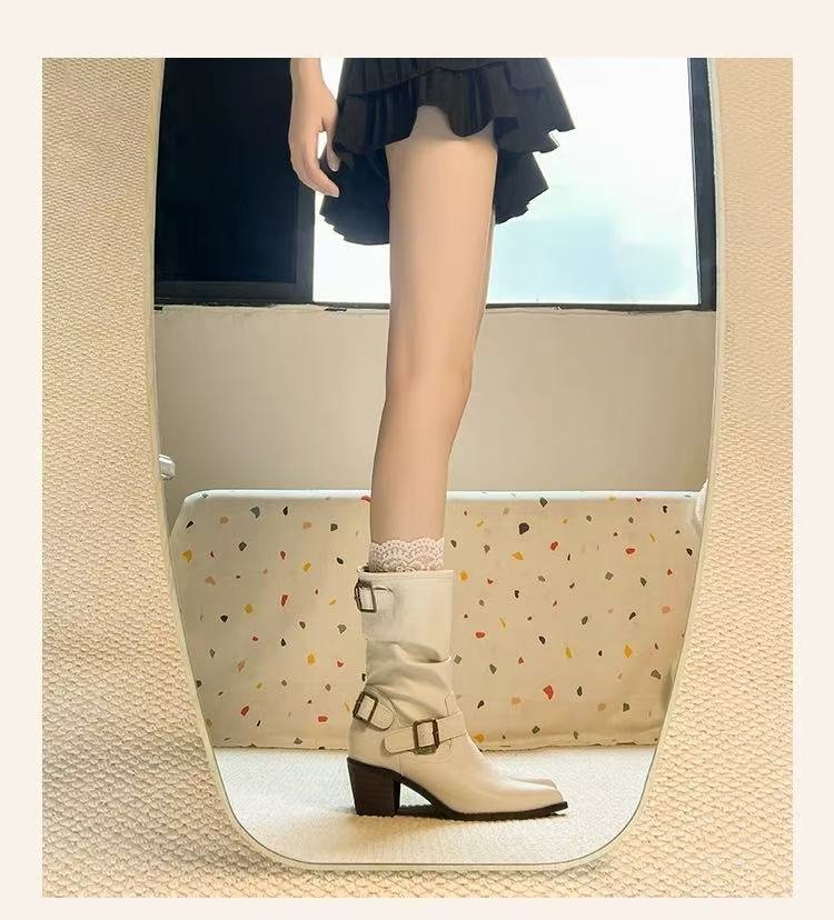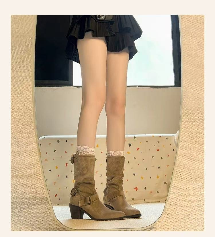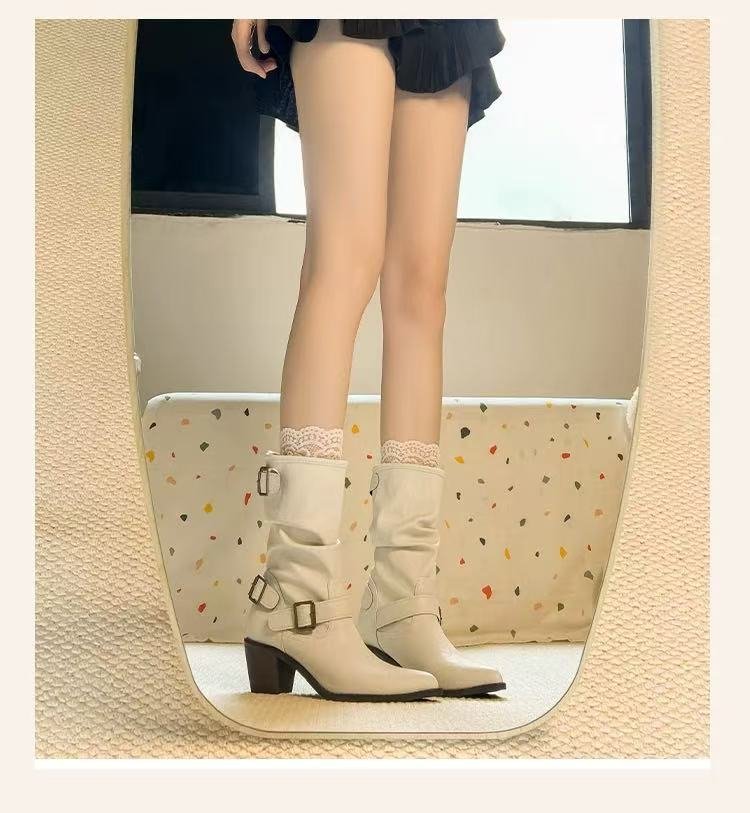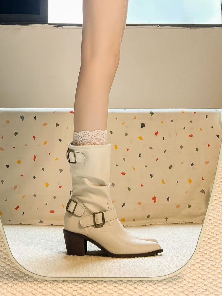 0 Review for Retro Mid-calf Stacked Pointed-toe Chunky-heel Boots