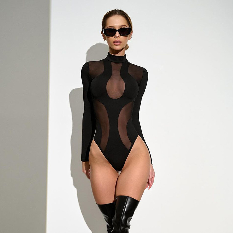 0 Review for See-through Mesh Patchwork Tight-fitting Cinched Long Sleeve Jumpsuit
