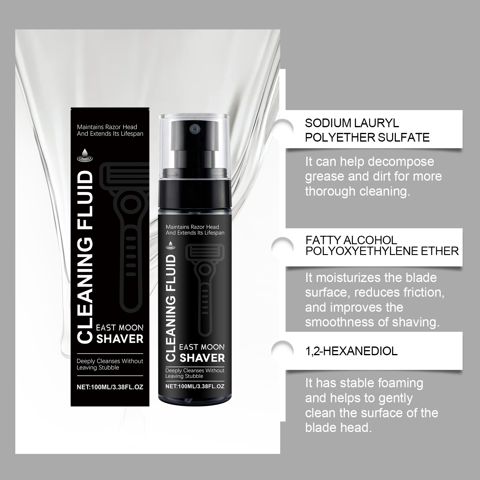 Ingredients: water, sodium lauryl polyether sulfate, fatty alcohol polyoxyethylene ether, decyl glucoside, 1,2-hexanediol.