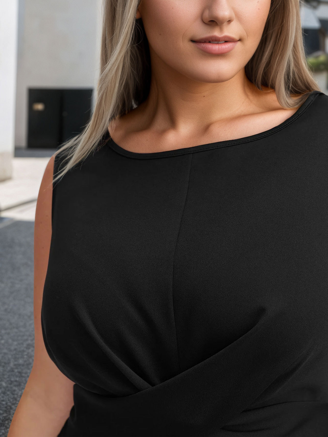 Sleeveless Cross-Collared Waist-Cinching Black Elegant Commuter Midi Dress