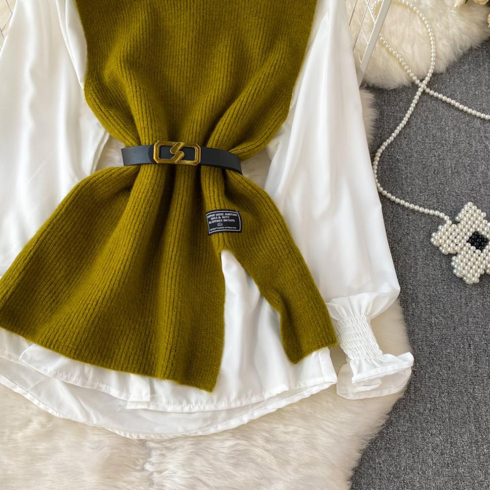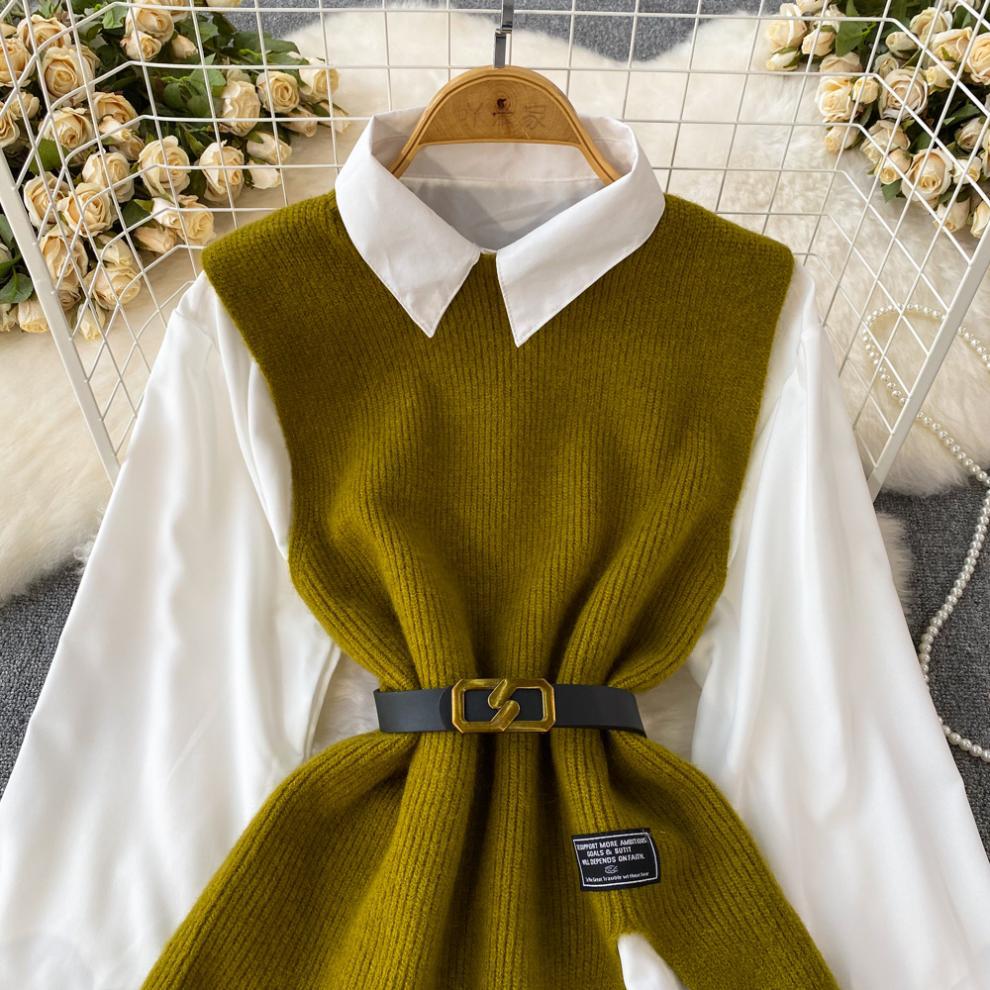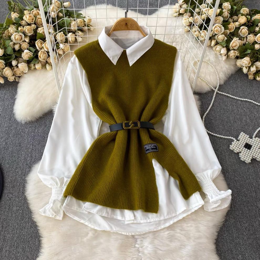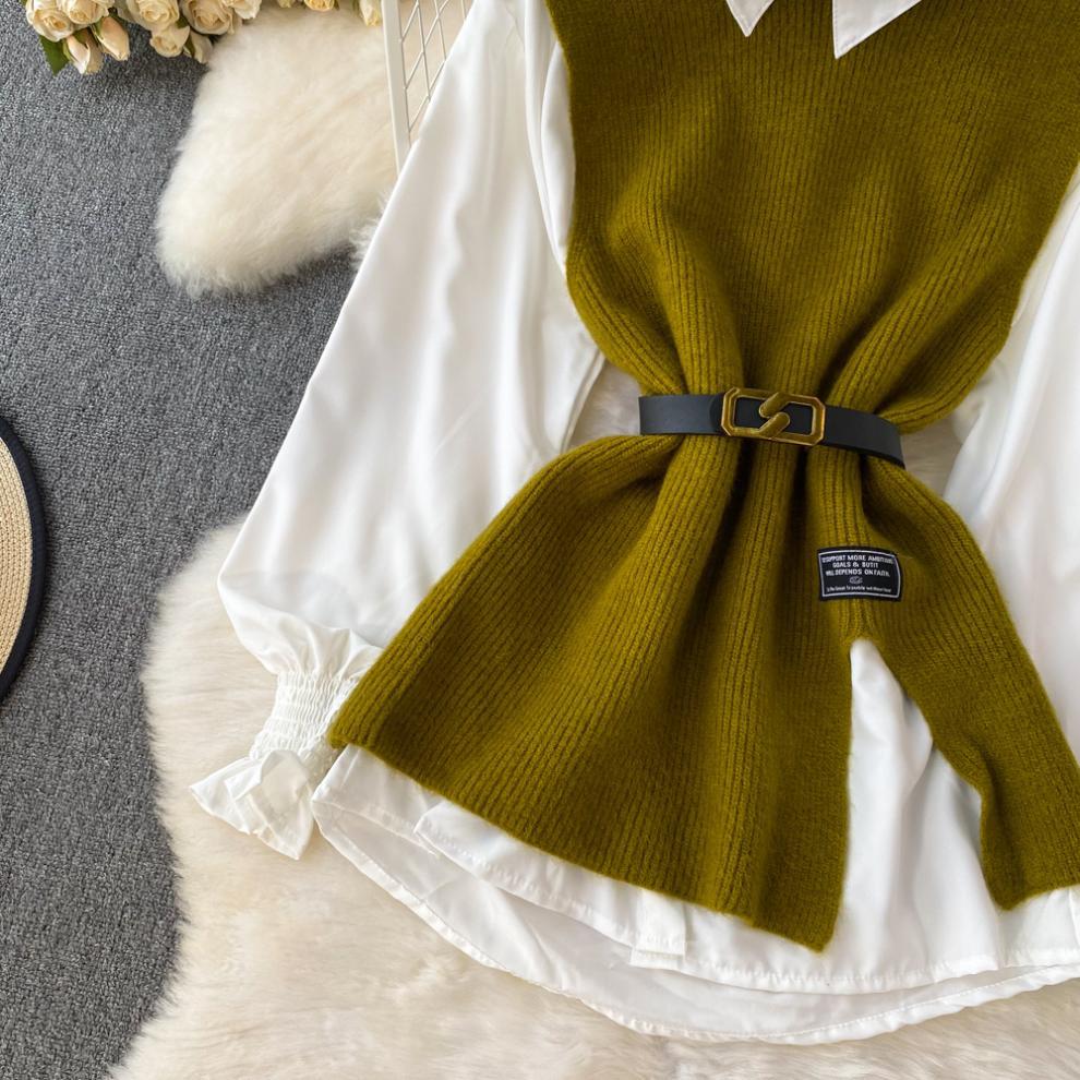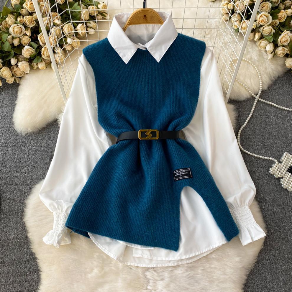 0 Review for Slit Knitted Vest Shirt Western Style Youthful-looking Two-piece Set