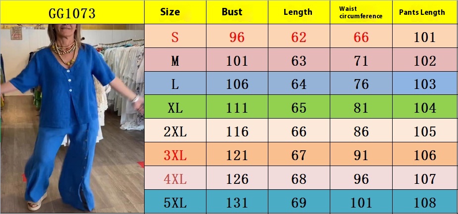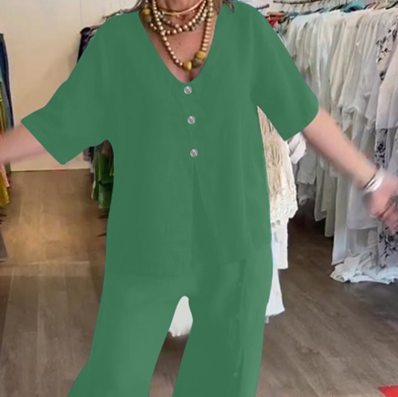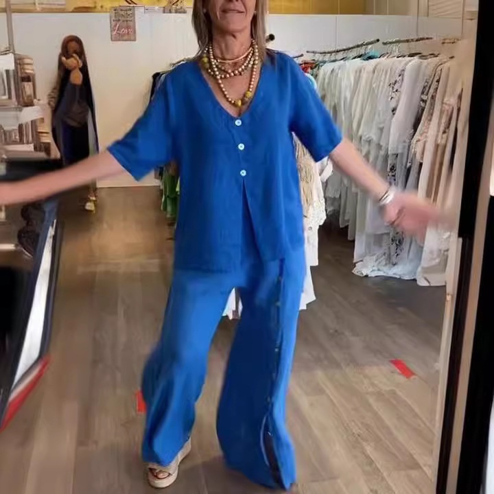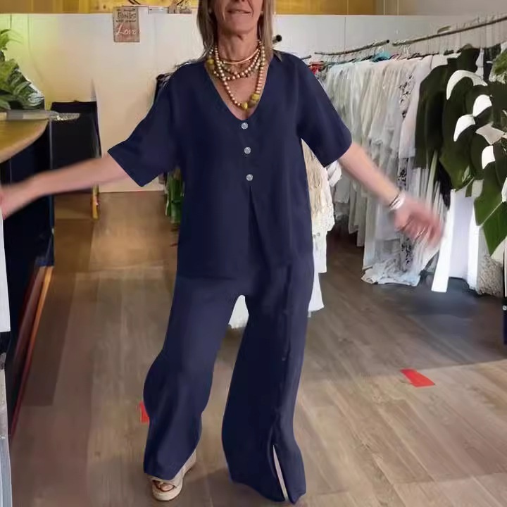 Solid Color Casual Short Sleeve Button Split Cotton And Linen Suit