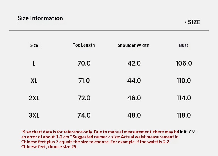 1. Asian sizes are 1 to 2 sizes smaller than European and American people. Choose the larger size if your size between two sizes. Please allow 2-3cm differences due to manual measurement. 2. Please check the size chart carefully before you buy the item, if you don't know how to choose size, please contact our customer service. 3.As you know, the different computers display colors differently, the color of the actual item may vary slightly from the following images.
