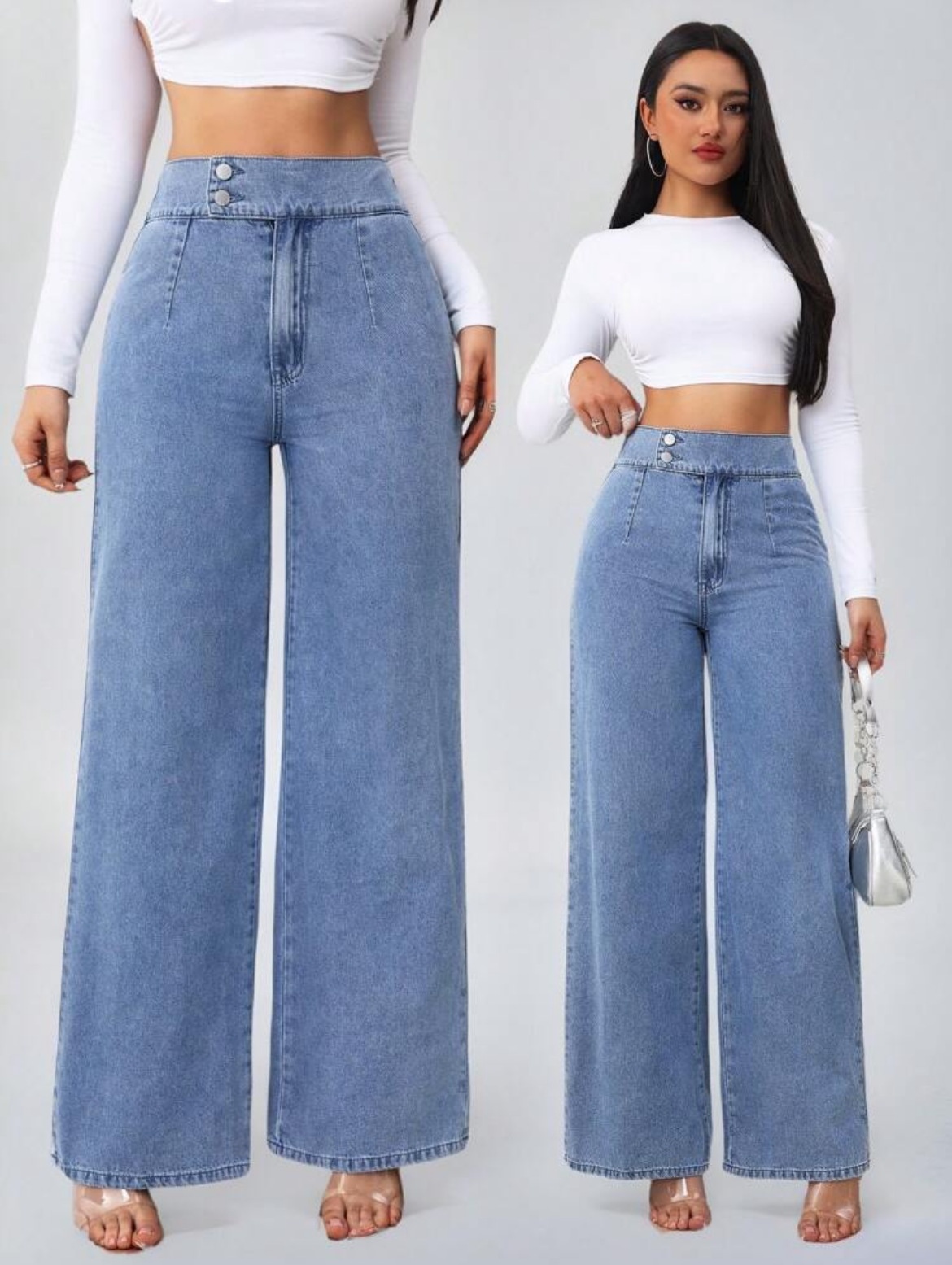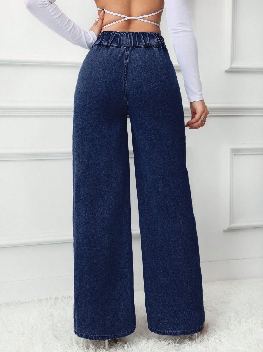 Versatile Straight-leg Loose-fit High-waisted Womens Solid-color Jeans With Double Buttons
