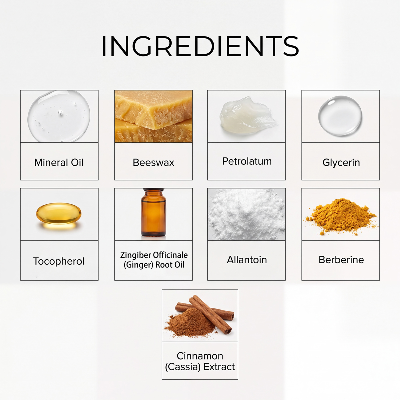 Ingredients: Active ingredients: tocopherol (vitamin E), ginger root oil, allantoin, berberine and cinnamon extract.