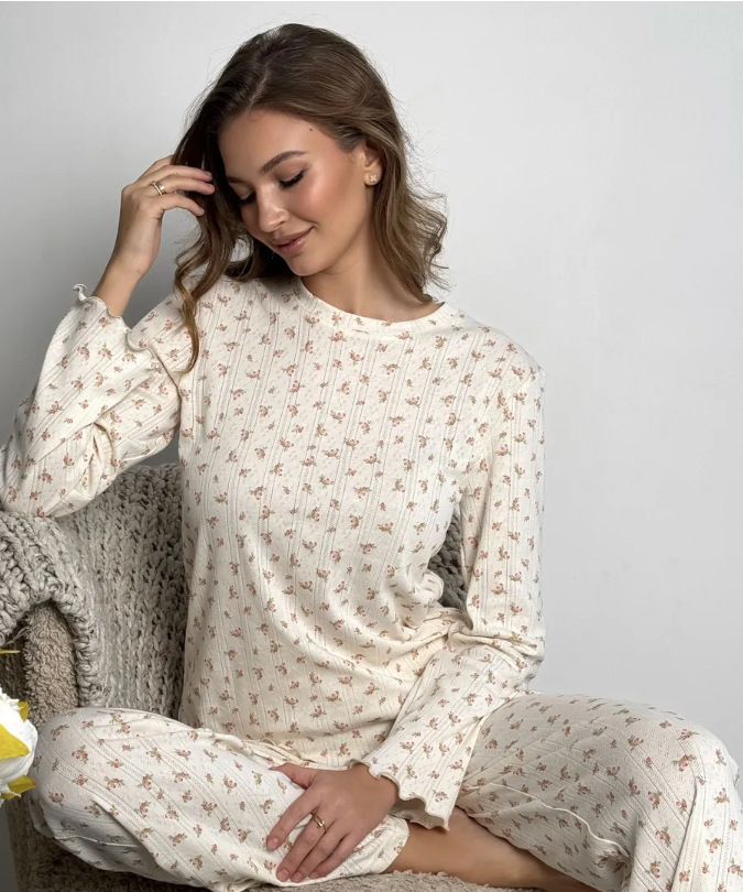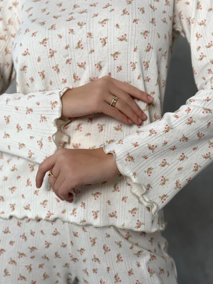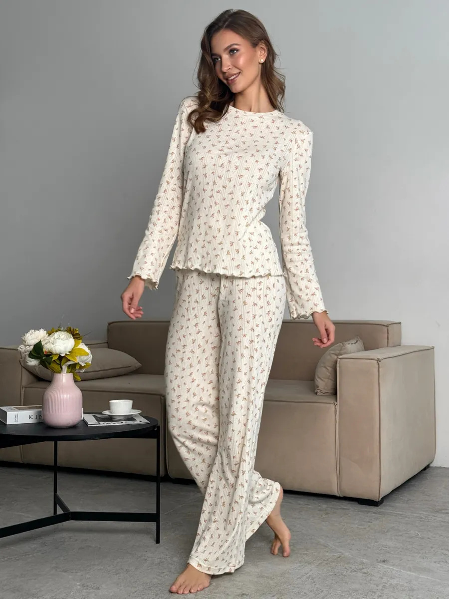 Women's Spring And Summer Floral Print Bell Sleeve Round Neck Top Wide Leg Pants Home Wear Suit