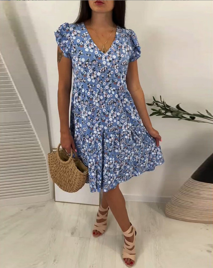 0 Review for Women's V-neck Floral Short Sleeve Slim Fit Dress