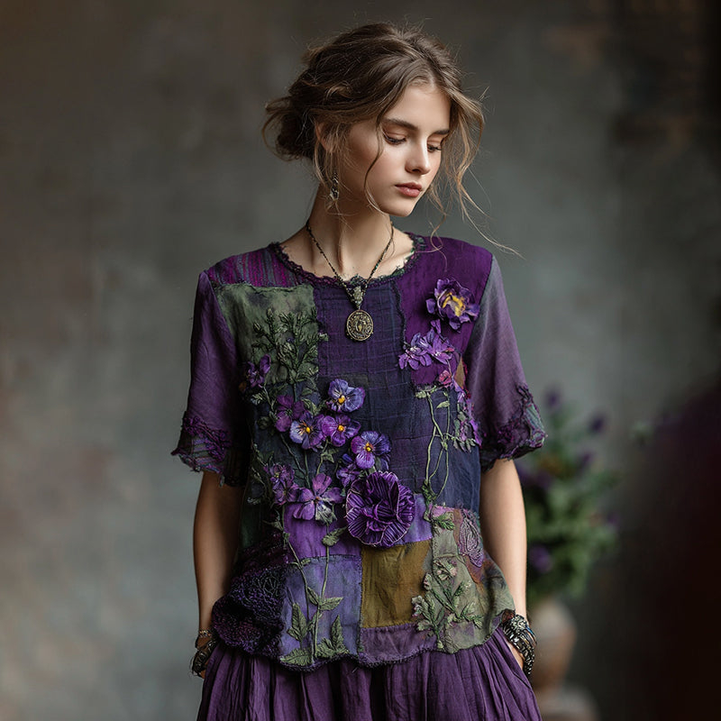 0 Review for Womens 3D-printed Crew-neck Retro Bohemian Top