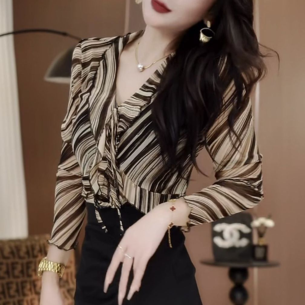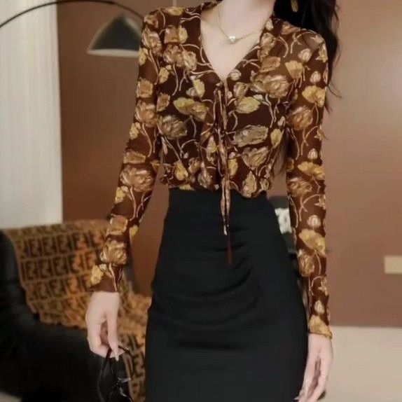 0 Review for Womens French-print Shirt With V-neck And Long Sleeves