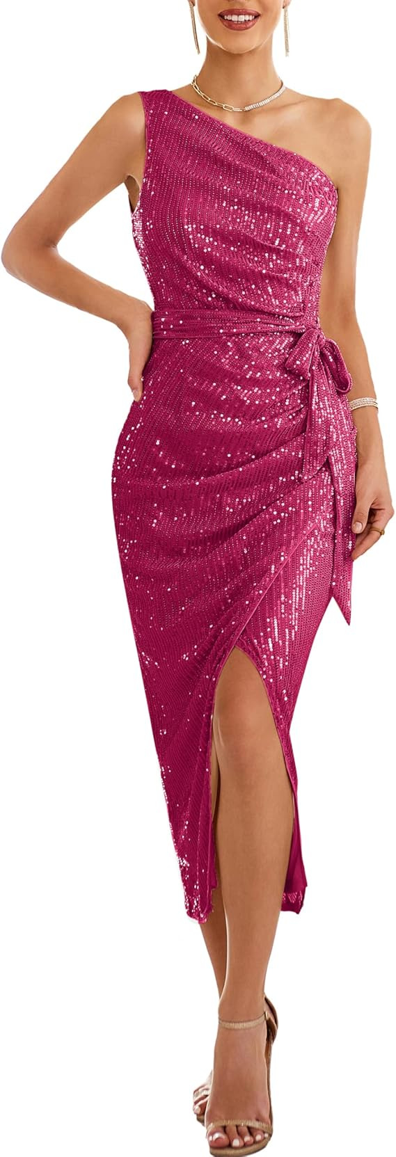 0 Review for Womens Sleeveless One-shoulder Sequin Dress