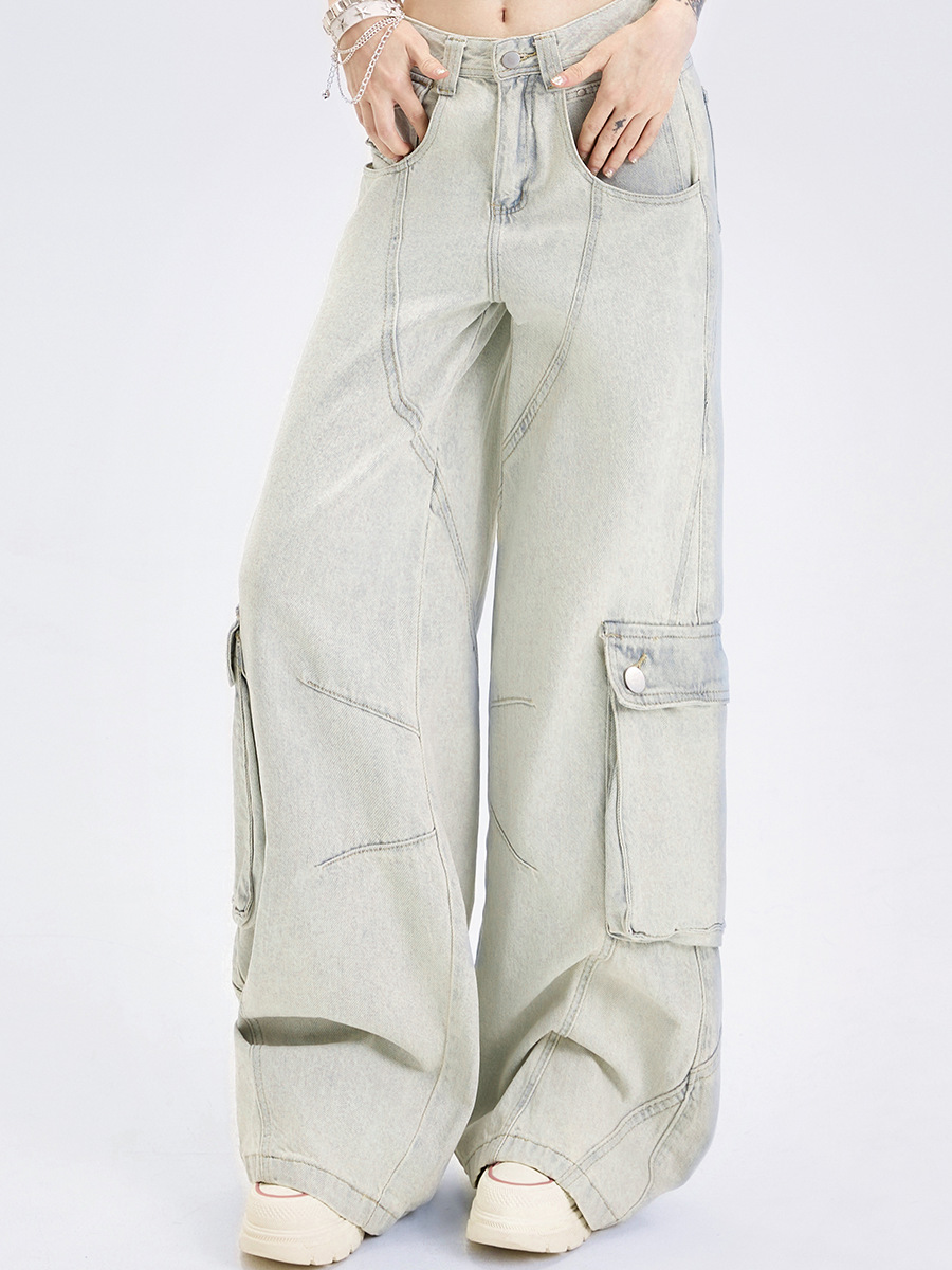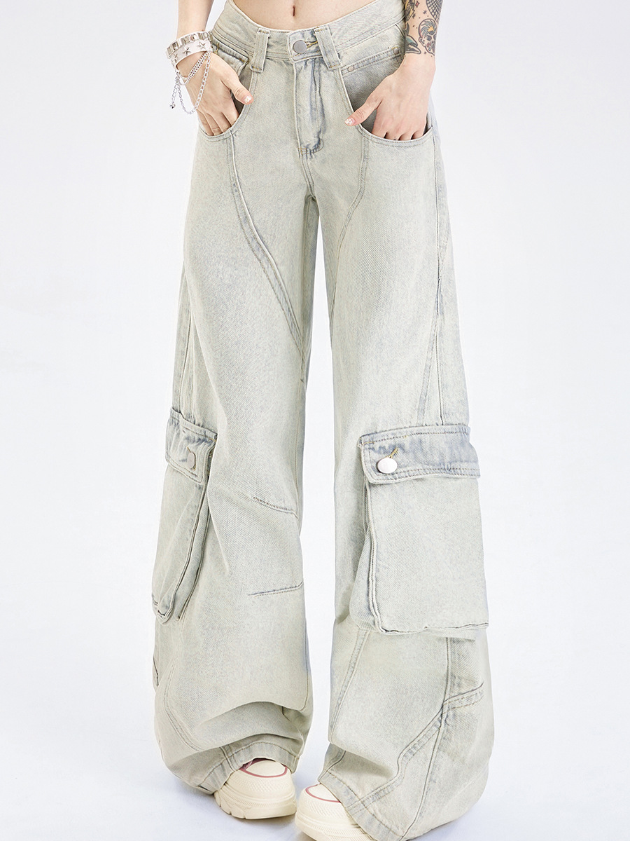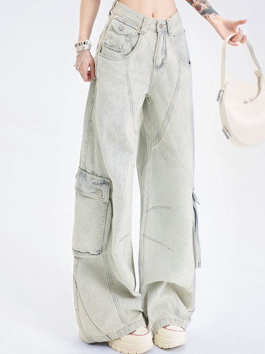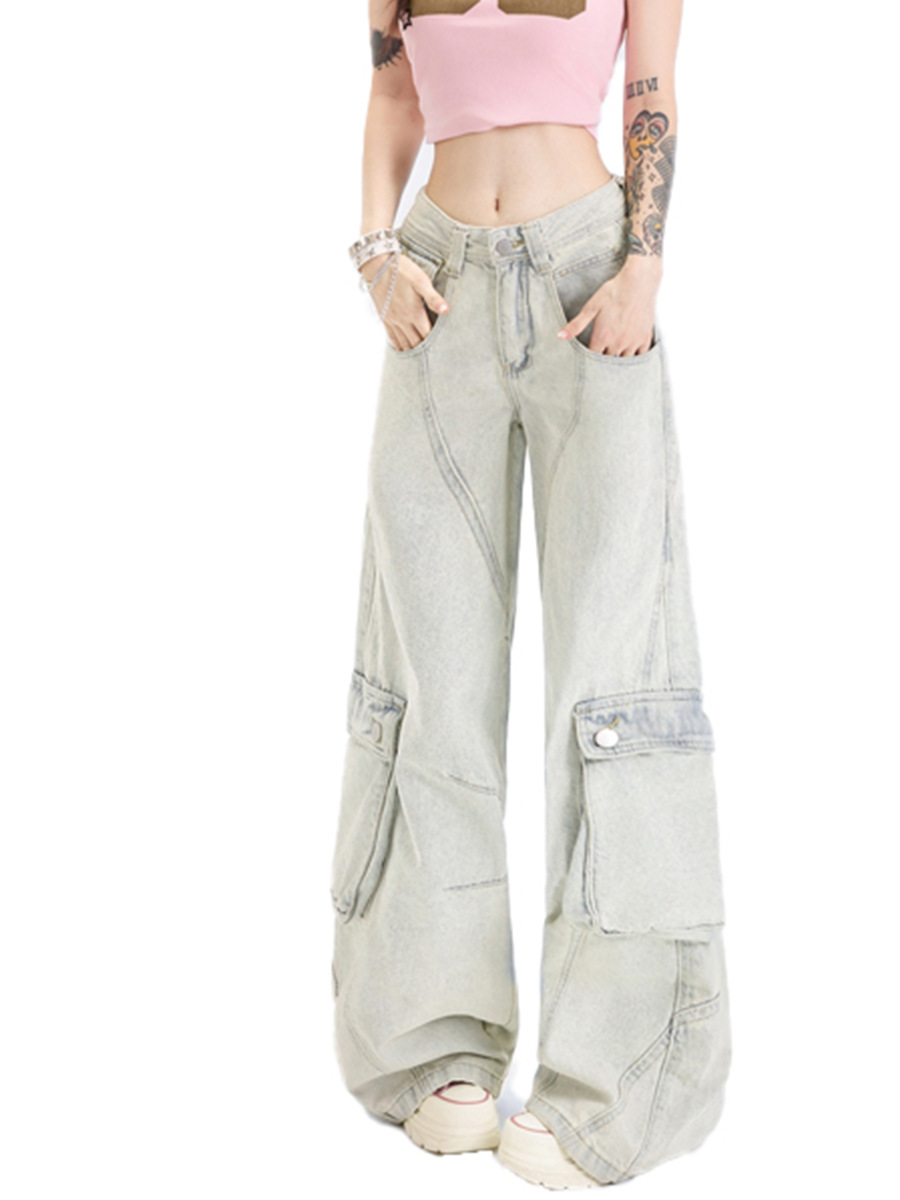 Womens Straight-Leg Multi-Pocket Workwear-Style Loose Wide-Leg Denim Jeans