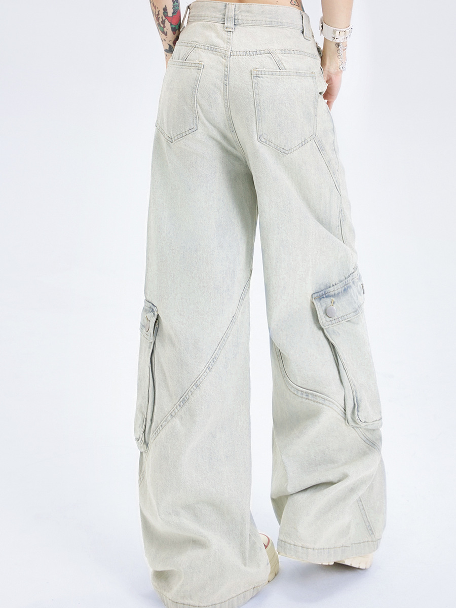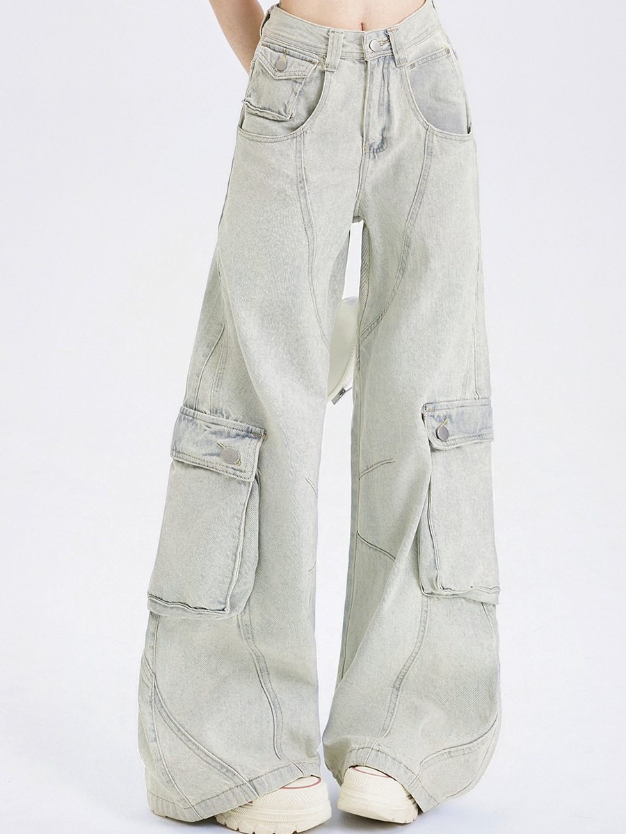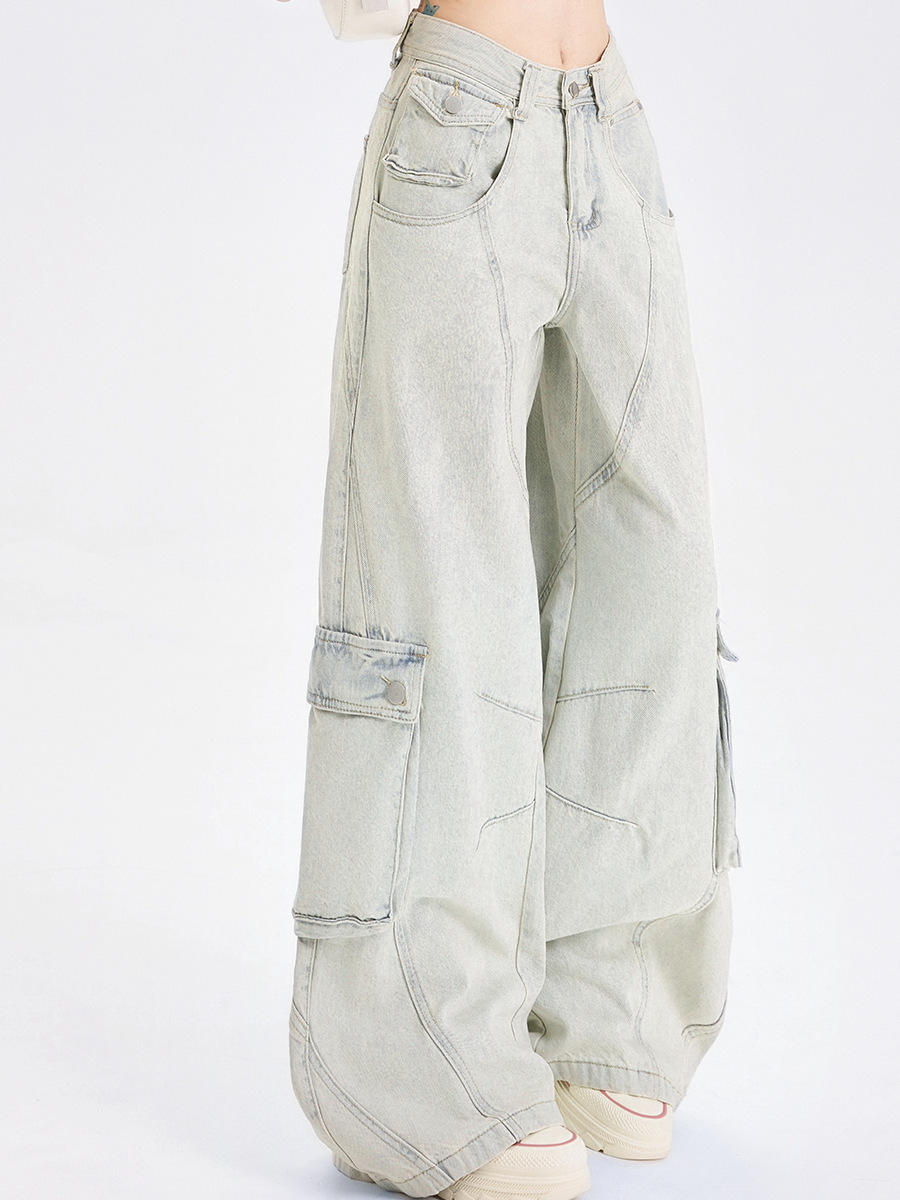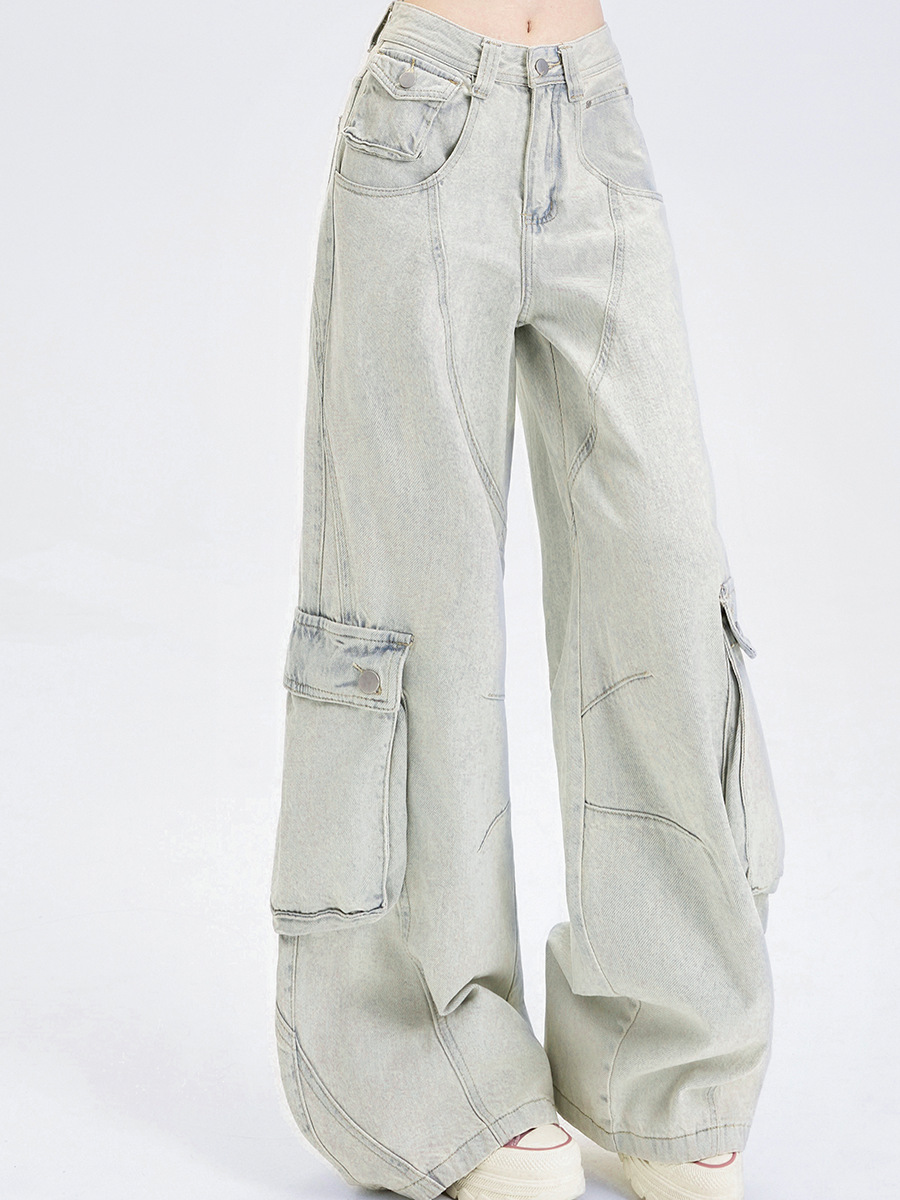 Womens Straight-Leg Multi-Pocket Workwear-Style Loose Wide-Leg Denim Jeans