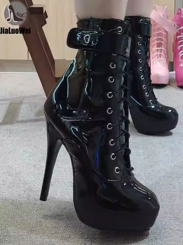 0 Review for 15CM Super High Heel Waterproof Lockable Sexy Lace-up Patent Leather High Heels