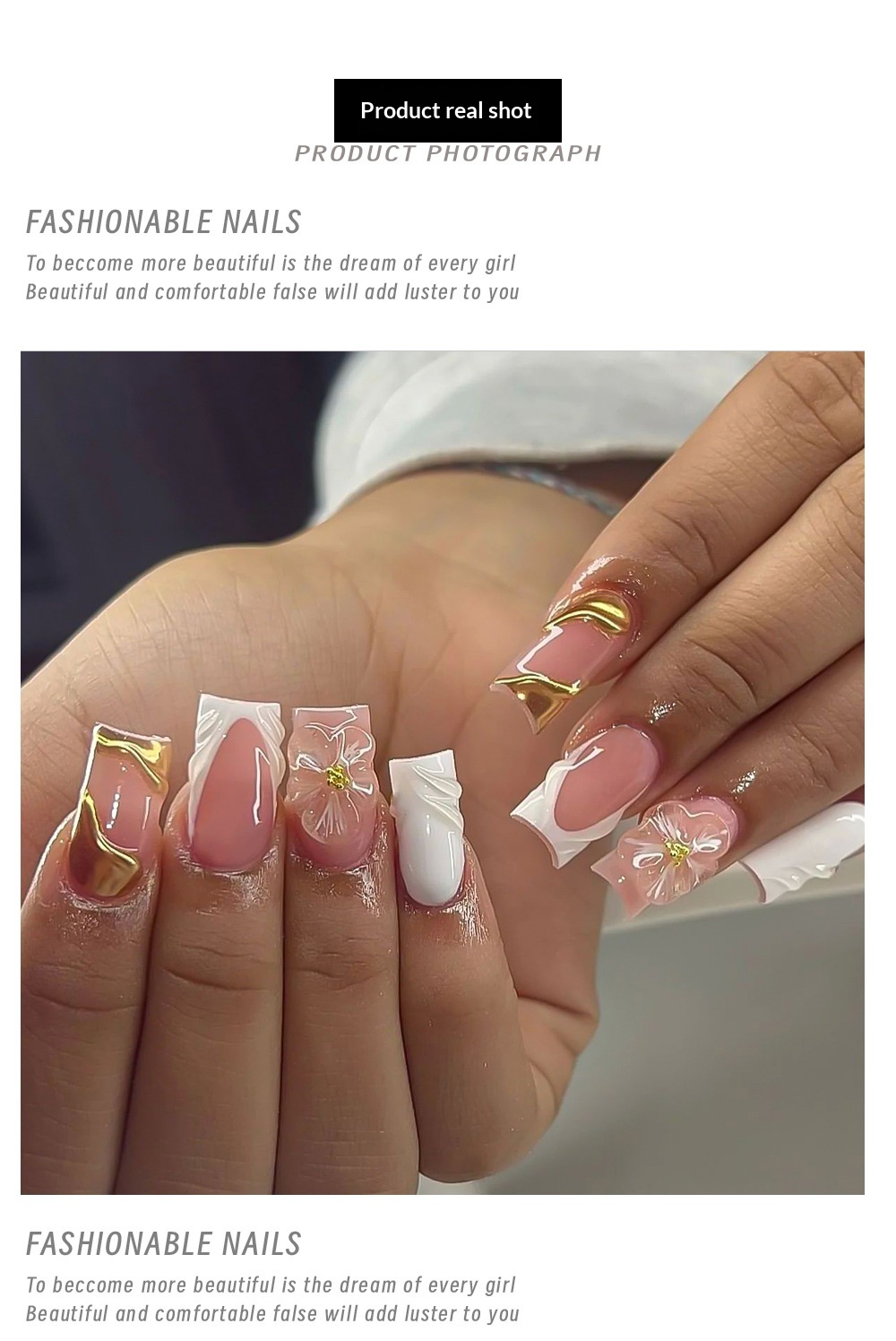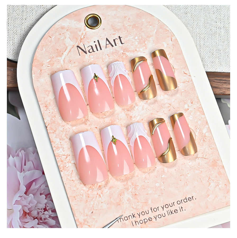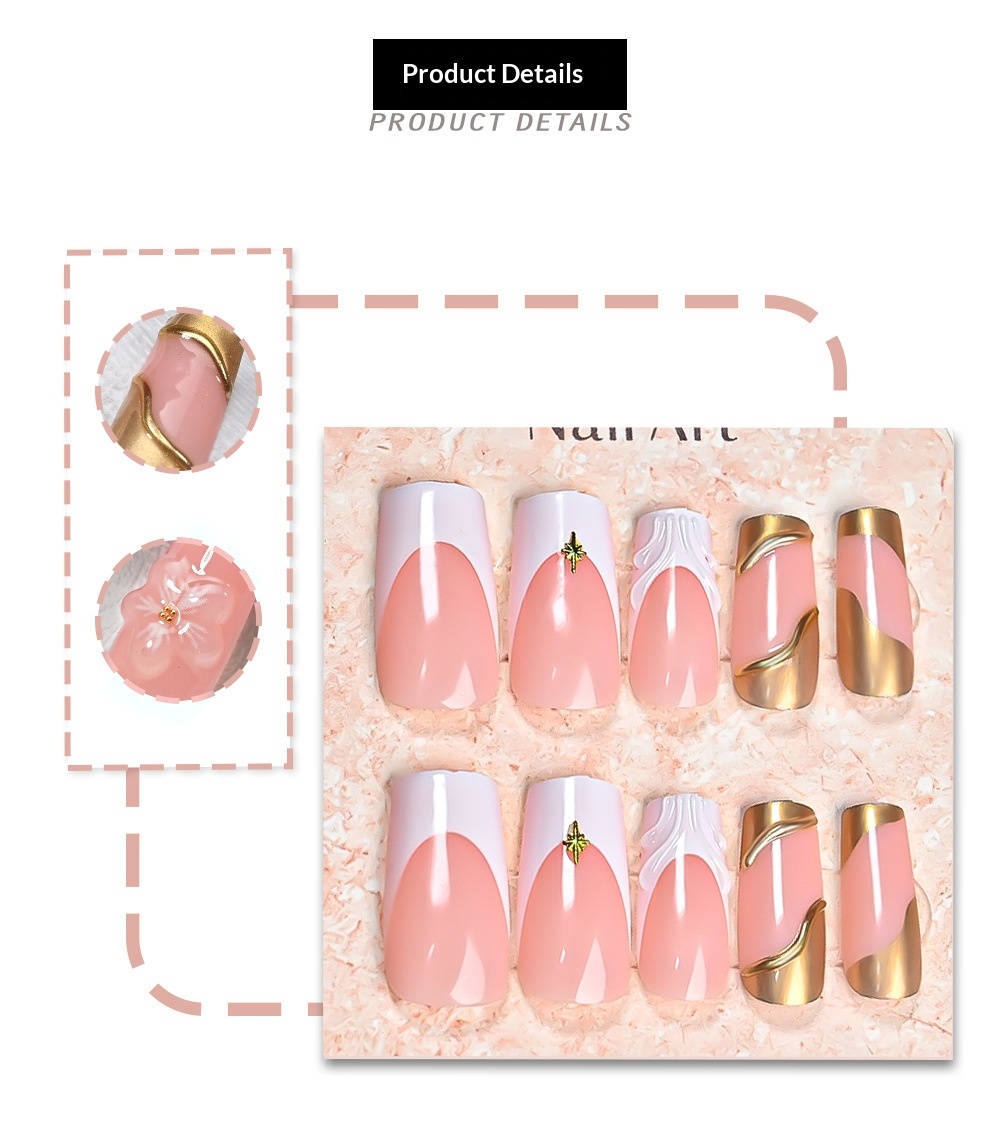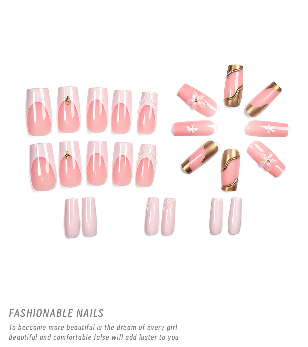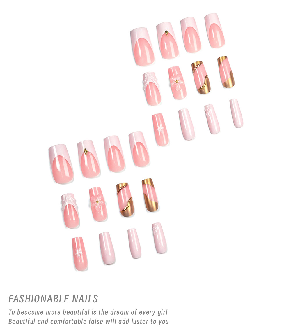 24-piece 3D Floral Gold-trimmed Plaid Artificial Nail Tips For Wearable Nails