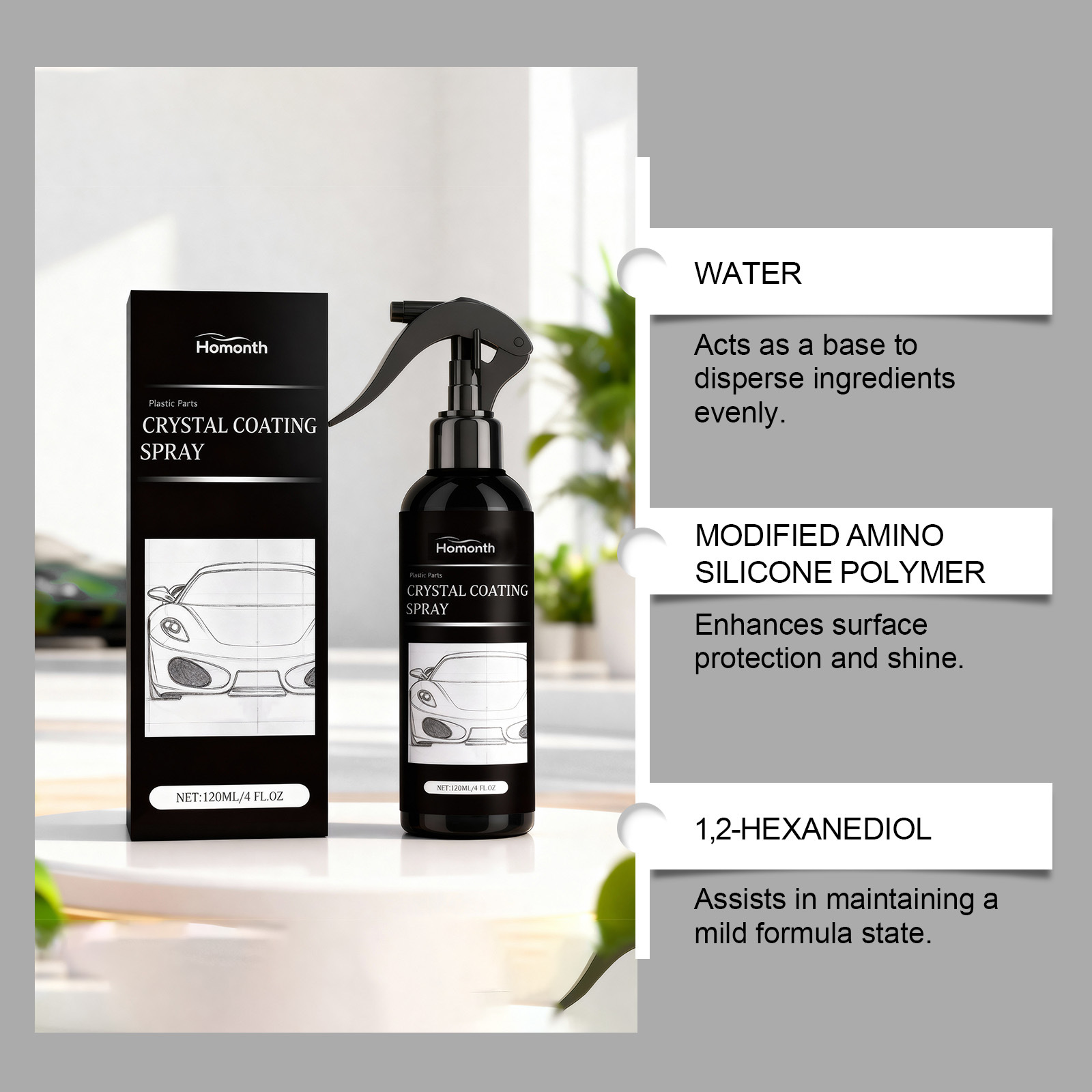 Ingredients: water, modified amino silicone oil polymer, ethylene copolymer, 1,2- hexanediol, EDTA-2Na.